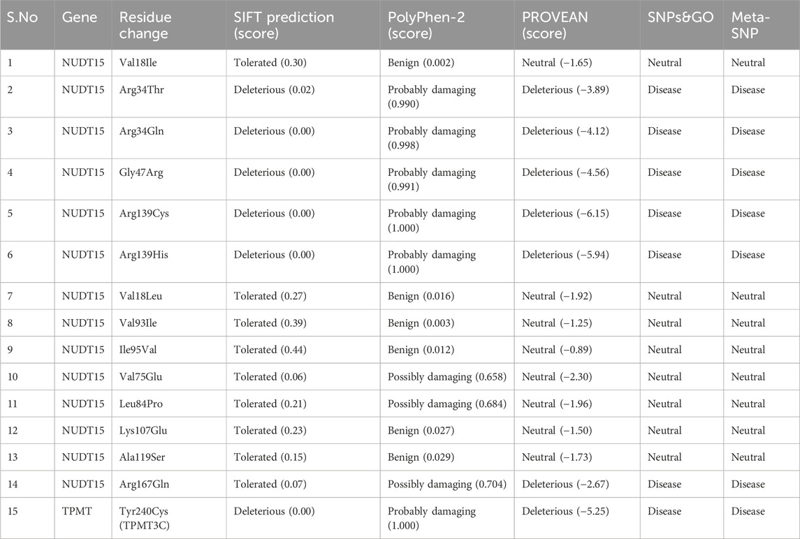An important component of our study was the use of comprehensive in silico analyses to prioritize NUDT15 and TPMT variants before wet lab validation. We employed multiple computational tools including SIFT, PolyPhen-2, PROVEAN, Meta-SNP, and SNPs and GO to assess conservation, structural impacts, and functional consequences of missense substitutions. Across these tools, NUDT15 c.415C>T (p.Arg139Cys) and TPMT 3C (p.Tyr240Cys) consistently scored as deleterious, predicted to destabilize protein folding or impair enzymatic function. These predictions are supported by recent bioinformatics studies such as Saxena et al. (2022), Jena et al. (2021), which identified known and novel TPMT missense SNPs predicted deleterious by in silico pipelines and molecular dynamics simulations; (Cook et al., 2023; Zgheib et al., 2020), who compared genotypes and phenotypes for TPMT and NUDT15 in a large pediatric cohort and found strong concordance between predicted functional impact and observed toxicity; and Zhou et al. (2020), Liang et al. (2016), who demonstrated high accuracy of algorithms in predicting in vivo consequences of TPMT variants.