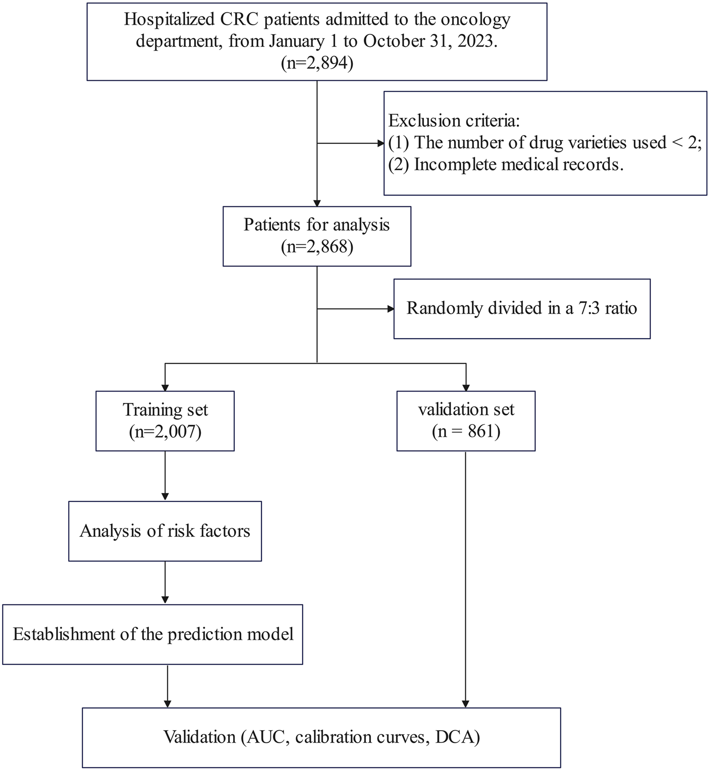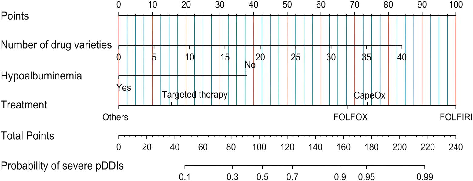 Potential drug-drug interactions (pDDIs) refer to the potential changes in the efficacy or toxicity of one drug caused by the simultaneous or sequential use of another drug, which may result in adverse drug reactions (ADRs), treatment failure, or even life-threatening events (Alkathiri et al., 2025; Demirkapu and Cavdar, 2024; Khanna et al., 2024; Meslamani and Abou Hajal, 2025). For CRC inpatients, the risk of pDDIs is significantly increased due to the long treatment cycle, diverse therapeutic drugs, and combined use of drugs for comorbidities. Previous studies have shown that the incidence of pDDIs in cancer patients ranges from 55.7% to 95.0%, and severe pDDIs can increase the length of hospital stay and the mortality rate (Pinto et al., 2023; Choudary et al., 2022; Wondm et al., 2023; Milovanovic and Pejcic, 2025; Ismail et al., 2020). However, there are few studies specifically focusing on the risk factors of pDDIs in CRC inpatients, and the existing studies have small sample sizes and lack reliable risk prediction models, making it difficult to provide effective guidance for clinical prevention and intervention of pDDIs.