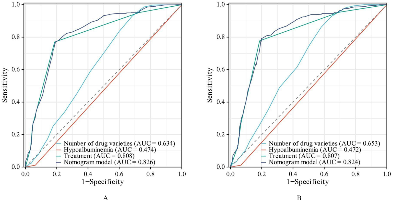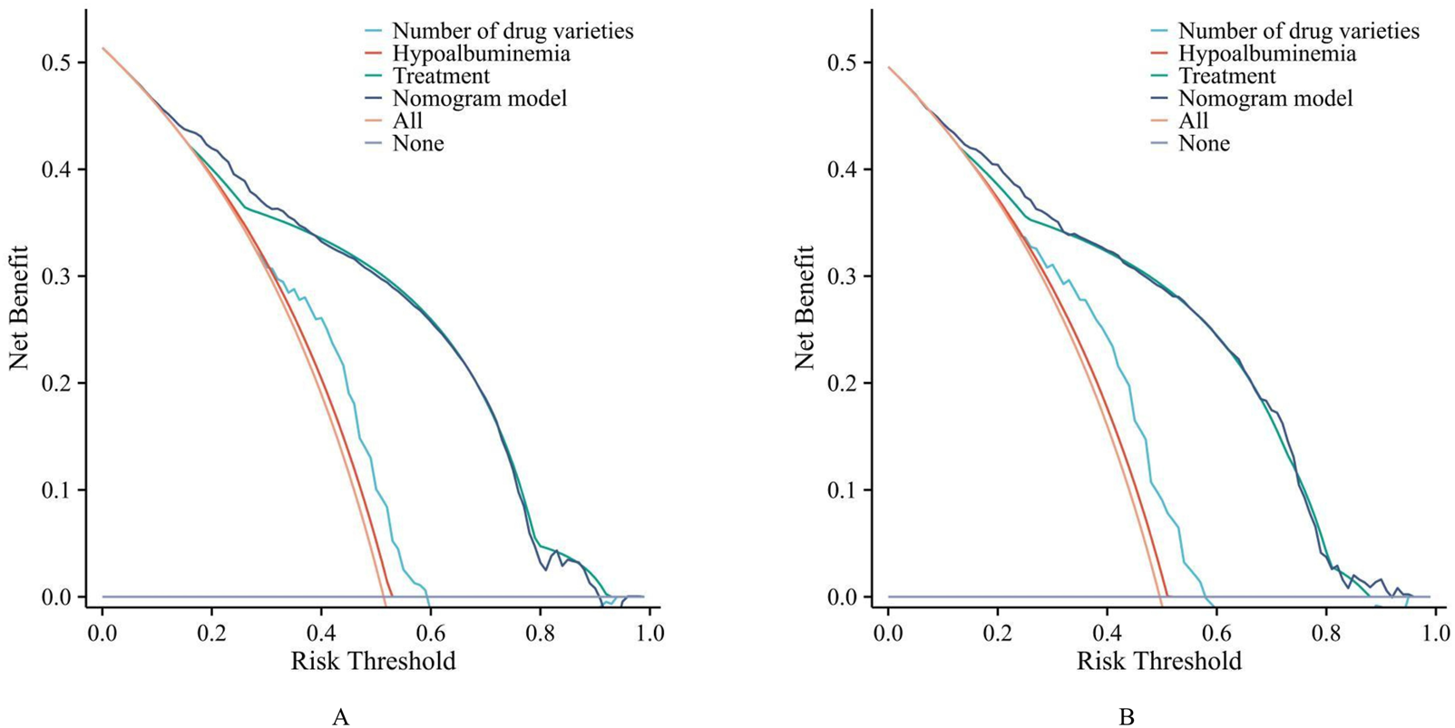 A total of 1,790 (62.41%) patients experienced at least one pDDIs, with 1,458 (50.84%) cases of severe pDDIs. The number of drug varieties, hypoalbuminemia, and treatment were independent risk factors. The area under the receiver operating characteristic curve (AUC) of the model in the training and validation sets were 0.826 and 0.824, respectively. The calibration curve showed a good agreement between the predicted probability and the actual occurrence probability. Decision curve analysis (DCA) demonstrated that the model had a positive net clinical benefit within a wide range of 10%–90%.