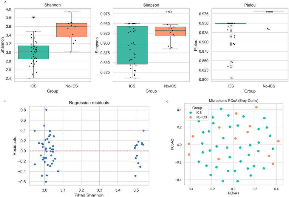 Figure 1. Effects of ICS on sputum microbial diversity in COPD patients. (A) Alpha diversity indices (Shannon, Simpson, Pielou’s evenness, Observed richness, and Chao1) were significantly lower in the ICS group compared with the No-ICS group (P < 0.05). (B) Regression residuals. (C) Principal coordinates analysis (PCoA) based on Bray–Curtis distance between ICS and No-ICS groups.