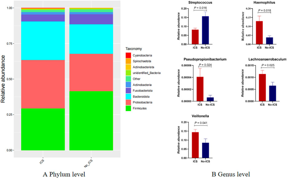 Figure 2. Taxonomic differences in airway microbiome between ICS and No-ICS groups. (A) Relative abundance of dominant phyla, showing reduced Firmicutes in the ICS group (P < 0.05). (B) Differentially abundant genera between groups, with enrichment of Streptococcus and Pseudopropionibacterium in the No-ICS group, and enrichment of Lachnoanaerobaculum, Veillonella, and Haemophilus in the ICS group (P < 0.05).