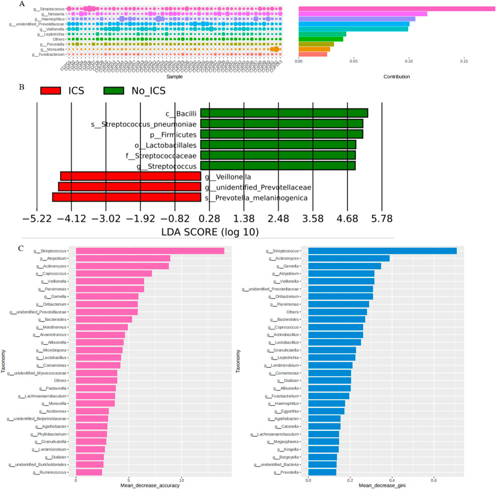 Figure 3. Discriminatory taxa and their contribution to group differences. (A) Simper analysis at the genus level shsowing the contribution of Streptococcus to intergroup variation. (B) Linear discriminant analysis (LDA) effect size (LEfSe) indicating taxa enriched in ICS versus No-ICS groups. (C) Random Forest analysis ranking taxa by importance for group discrimination, highlighting Streptococcus as the most influential genus.