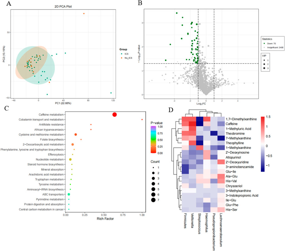 Figure 4. Metabolomic differences and microbiome–metabolite correlations. (A) Principal component analysis (PCA) of metabolomic profiles showing clear separation between ICS and No-ICS groups. (B) Volcano plot of 70 differentially expressed metabolites (VIP ≥1, |log2FC| ≥ 1, P < 0.05), predominantly downregulated in the ICS group. (C) KEGG pathway enrichment of differential metabolites, highlighting caffeine metabolism, cobalamin transport and metabolism, antifolate resistance, and cysteine/methionine metabolism. (D) Heatmap of Spearman correlations between top 20 differential metabolites and key microbial taxa. Negative correlations observed between Streptococcus and methylxanthines (caffeine, theobromine, 1,7-dimethylxanthine, 1-methylxanthine), whereas Veillonella exhibited positive correlations with these metabolites (P < 0.05).