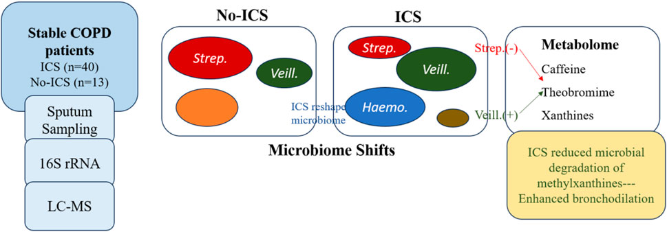 This study provides integrated microbiome and metabolome evidence that ICS therapy reshapes the airway microenvironment in patients with stable COPD. Our findings highlight two major insights: (i) ICS alters the taxonomic composition of the airway microbiome, reducing Streptococcus and enriching genera such as Veillonella and Haemophilus; and (ii) ICS profoundly influences metabolic pathways, particularly caffeine metabolism, with potential microbe–metabolite correlations Together, these results suggest that ICS exerts therapeutic effects not only through classical anti-inflammatory mechanisms (Lea et al., 2023) but also may via modulation of host–microbiome metabolic interactions.