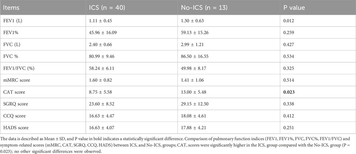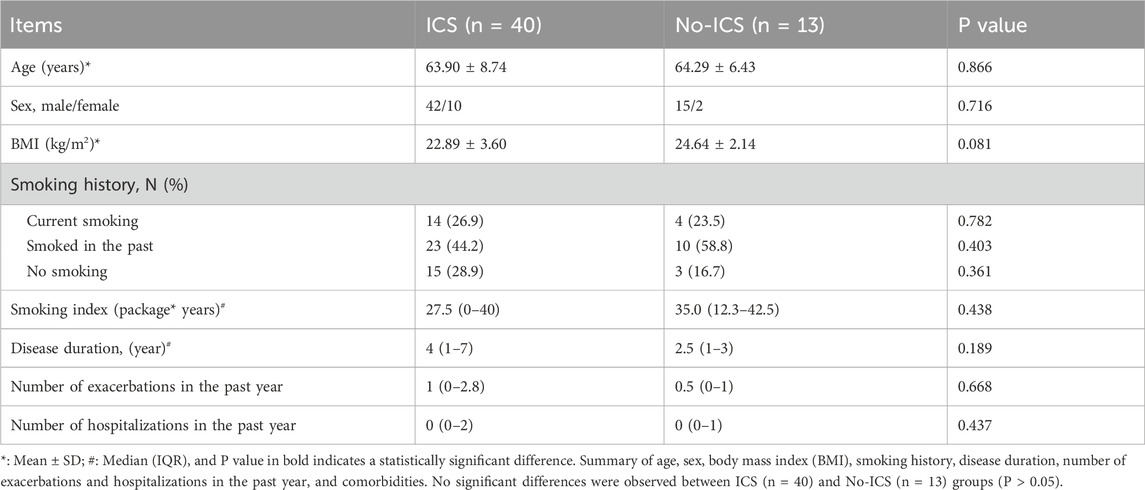 The two groups showed no significant differences in baseline demographics or lung function (P > 0.05), although the CAT scores were higher in the ICS group (P = 0.023) (Tables 1, 2), indicating that patients using ICS had a greater symptom burden. The full list of ICS medications has been added, including budesonide, fluticasone, along with their dose. No patients were on ICS during sampling. Details are included in Supplementary Table S1. The Supplementary Table S2 has been listed all concomitant medications (bronchodilators, statins, antihypertensives, antidiabetics).