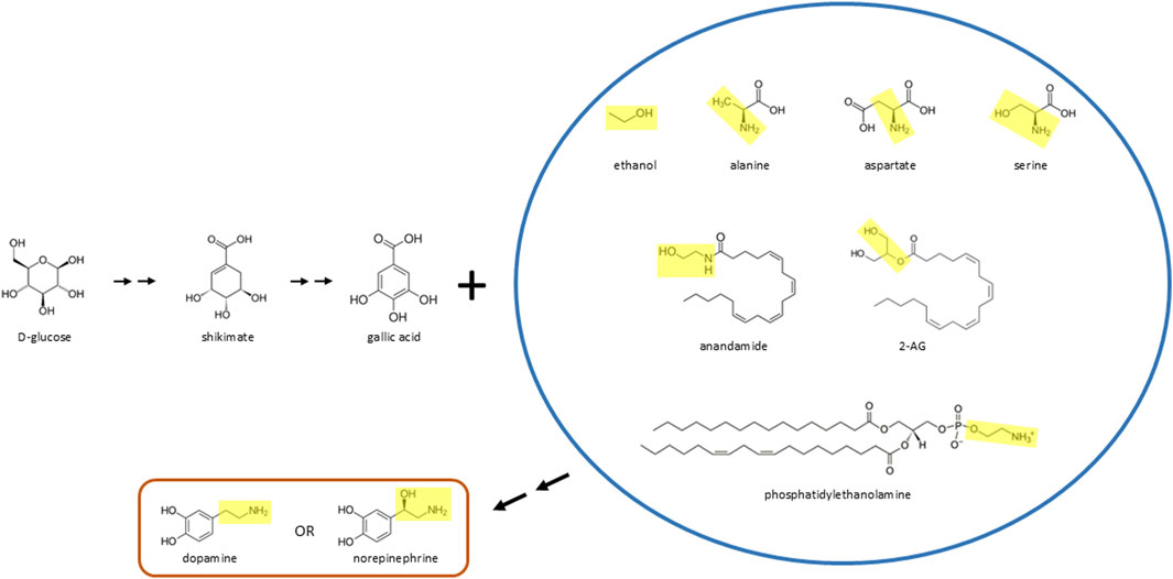 Figure 1. D-glucose may be biotransformed and then react with various molecules to form catecholamines in vivo. In this scenario, D-glucose is converted to gallic acid (or a similar phenylic molecule) and then reacts with ethanol, various amino acids (alanine, aspartate, serine), endocannabinoids (anandamide, 2-AG), or fats (phosphatidylethanolamine or related molecules) to form dopamine or norepinephrine. The yellow boxes inside the blue circle highlight the moiety, in many cases ethylamine or ethanolamine, that reacts with gallic acid (which is decarboxylated) to form dopamine or norepinephrine, which can then lead to formation of epinephrine through the canonical molecular pathway described over 70 years ago. Double arrows indicate two or more chemical reactions.