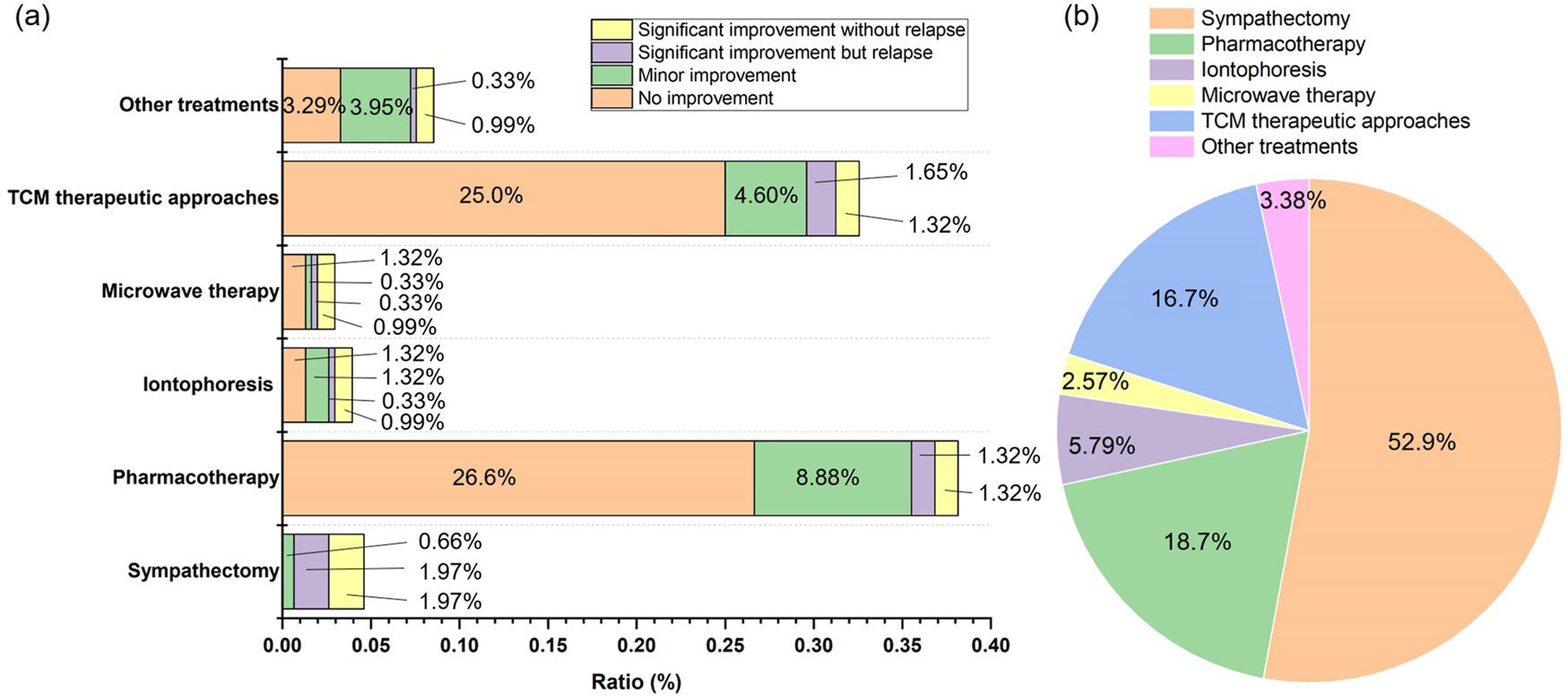 All participants were inquired about treatments received since PH onset (Figure 1a). The proportions of patients who had undergone sympathectomy, iontophoresis, and microwave therapy were 4.60%, 3.96%, and 2.97%, respectively. In contrast, pharmacotherapy and Traditional Chinese Medicine (TCM) therapeutic approaches were used by 38.1% and 32.6% of participants, respectively. However, 25.0% of those who tried TCM therapeutic approaches and 26.6% of those receiving pharmacotherapy reported no symptomatic improvement, while only 4.60% (TCM therapeutic approaches) and 8.88% (pharmacotherapy) noted minor improvement. Evaluation of patient awareness regarding available treatments (Figure 1b) revealed that 52.9% were aware of sympathectomy. In comparison, awareness was lower for pharmacotherapy (18.7%) and TCM therapeutic approaches (16.7%). Knowledge of other interventions was limited, with only 5.79% aware of iontophoresis and 2.57% of microwave therapy.