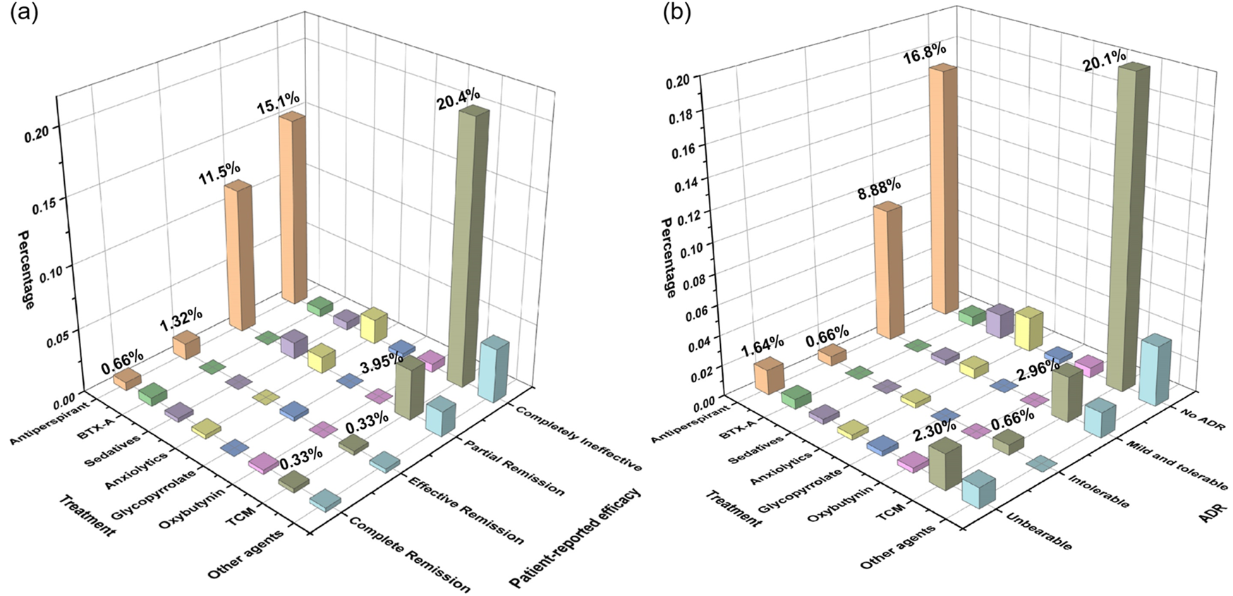 Though guidance provides various treatment recommendations according to HDSS score (McConaghy and Fosselman, 2018), our survey revealed that pharmacotherapy (38.1%) and TCM therapeutic approaches (32.6%) were the most commonly tried modalities. In contrast, iontophoresis and microwave therapy showed limited adoption, the low uptake of these modalities is likely attributable, at least in part, to their dependence on specialized equipment and the need for repeated clinic visits, compounded by extremely low patient awareness (iontophoresis 5.79%, microwave therapy 2.57%), these factors that may jointly limit both accessibility and long-term adherence. Our analysis revealed higher utilization rates of antiperspirants and TCM; However, patient-reported efficacy was suboptimal. The majority of TCM users reported no therapeutic benefit, whereas 40.2% of antiperspirants users experienced partial symptom relief - compared to only 15.8% for TCM. Safety profiles were generally favorable for both, though antiperspirants were associated with a higher incidence of reported ADRs (40.0% vs. 22.8% for TCM). However, the patient-reported effectiveness of TCM should be interpreted cautiously. TCM management of PH emphasizes holistic ‘pattern-based diagnosis and treatment’ and long-term constitutional regulation; its therapeutic goals may extend beyond rapid, short-term sweat suppression to include alleviation of accompanying symptoms and re-balancing of systemic status.