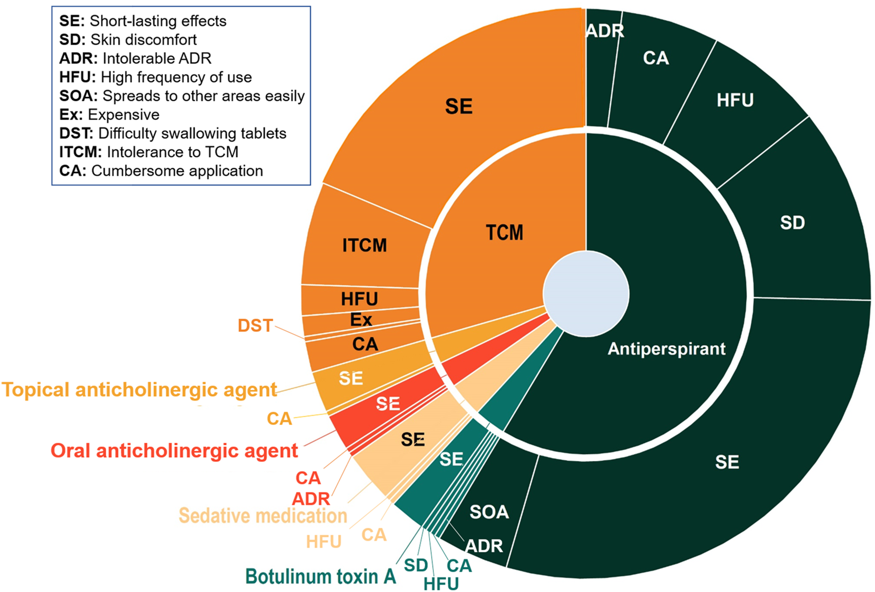 Building on prior medication experiences, patients identified short-lasting effects as the primary drawback of antiperspirants. Skin discomfort following topical application was another significant concern. For TCM, a considerable proportion of users reported difficulty tolerating its characteristic flavor. These findings underscore that efficacy, durability, convenience, and comfort are critical determinants of treatment decisions, highlighting the need for healthcare quality improvements that prioritize patient-reported experiences and tolerability (Mansfield et al., 2019).