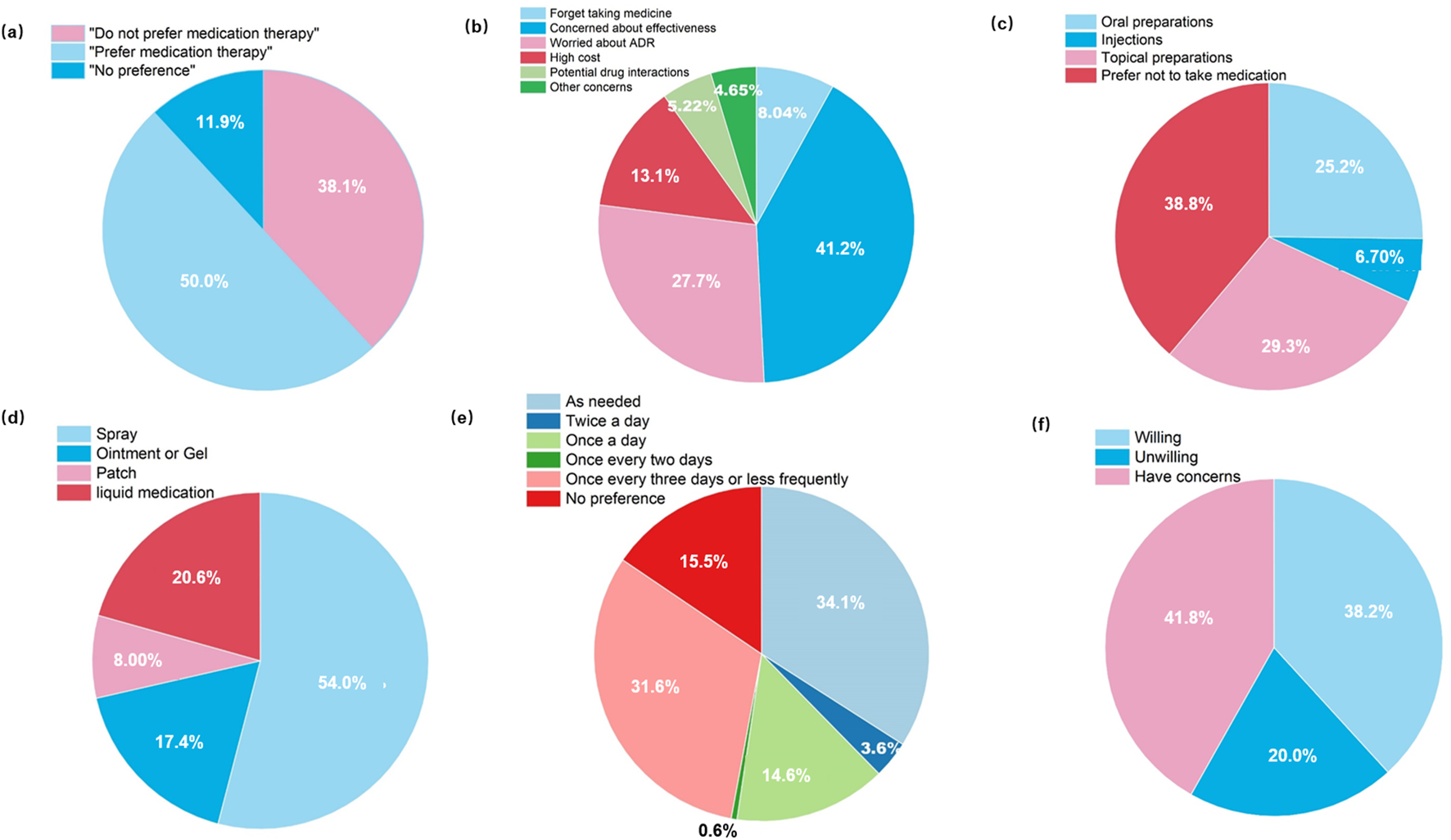 We further examined key drivers of pharmacotherapy preferences. Half of patients (50.0%) expressed willingness to use pharmacotherapy, with efficacy and ADRs being their foremost concerns. Treatment cost also emerged as a significant factor. These priorities align with the core principles of pharmacotherapy: safety, efficacy, and cost-effectiveness. Additionally, patients favored convenience-oriented delivery systems, with 29.3% preferring topical preparations and 25.2% oral formulations - especially sprays - reflecting the need for user-friendly administration in hand-focused hyperhidrosis. Dosing frequency preferences included convenient use (34.1%) and applications no more frequent than every 3 days (31.6%), indicating that treatment burden substantially influences real-world adherence.