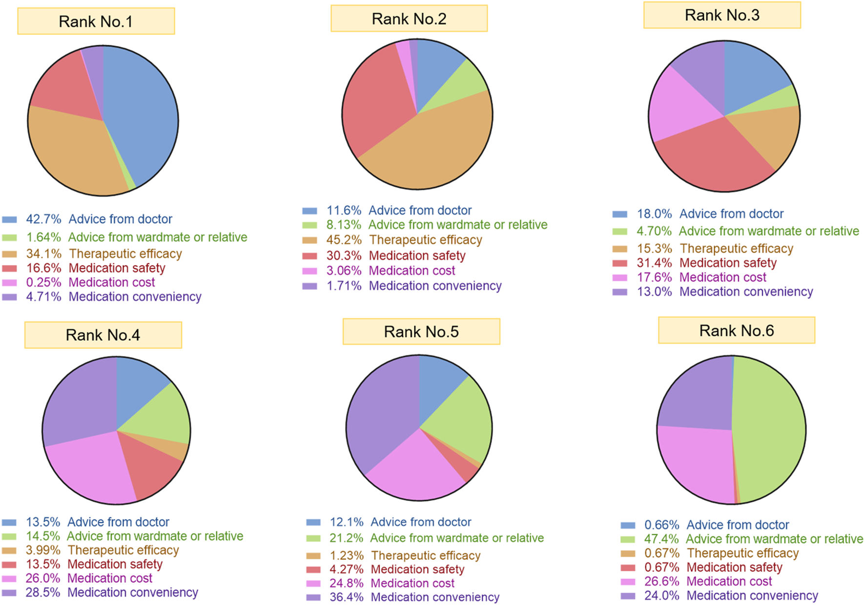 When ranking factors influencing medication choices, physician recommendations were the most influential (42.7% first-rank), underscoring the central role of clinicians in PH treatment decisions within China’s medical context (Han et al., 2022). Medication efficacy and safety were ranked second and third, respectively, consistent with our findings above. Price and convenience of medication use were less dominant, while recommendations from relatives or wardmates were least important - reinforcing patients’ trust in medical authority.