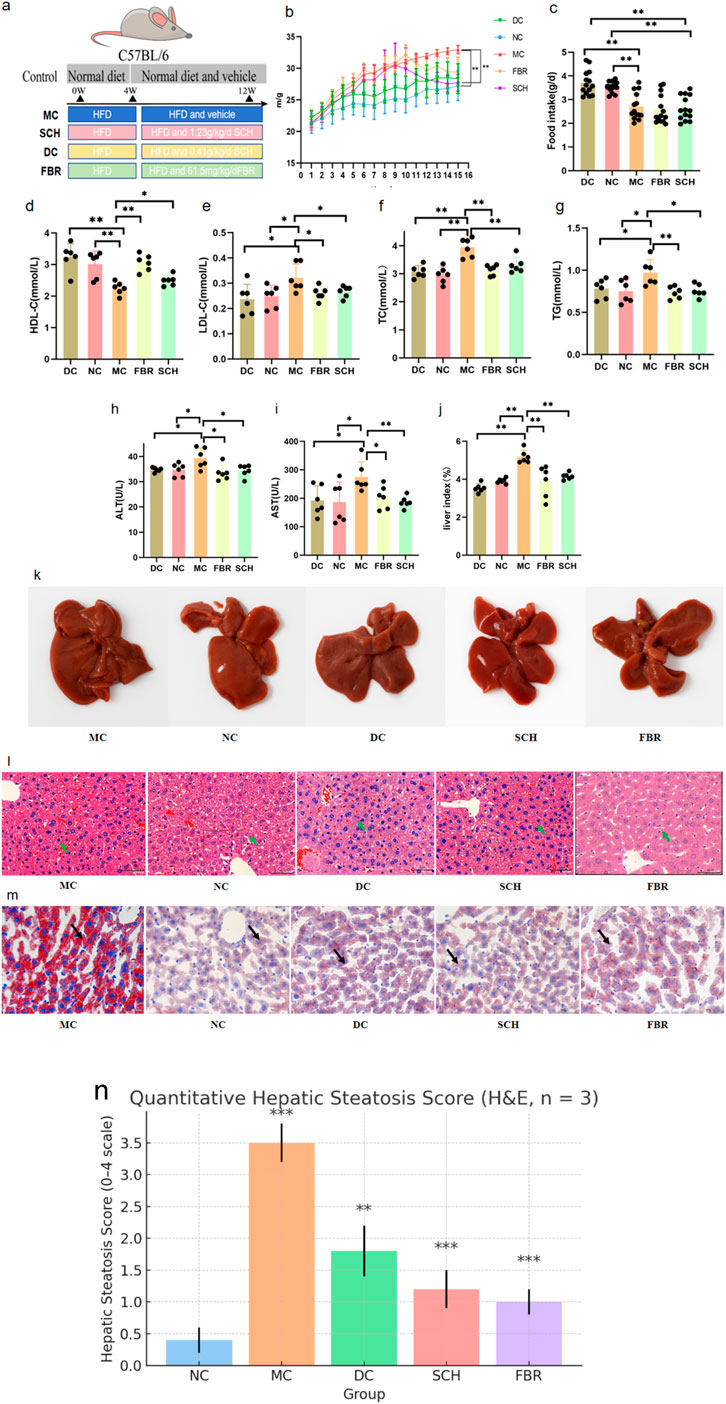 Figure 2. Physiological and histological improvements after Schisandra chinensis treatment.Data are expressed as the mean ± SD (n = 8) (a) In the animal experiment process, the Control group is represented in gray, the Model group in blue, the SCH group in pink, the DC group in yellow, and the FBR group in green. (b) Effect of Schisandra chinensis on body weight in NAFLD mice. (c) Food intake of each group during intervention. (d–g) Changes in serum lipid profiles after intervention. (h–j) Improvements in liver function biomarkers. (k) Pathological changes in mouse liver tissue. (l) H&E staining of liver tissues. (m) Oil Red O staining of hepatic lipid droplets. (n) quantitative steatosis scores. (0–4 scale; n = 3 per group, mean ± SD). Significance labels in the figure: P < 0.001: MC group vs. NC group, SCH group vs. MC group, FBR group vs. MC group P < 0.01: DC group vs. MC group.