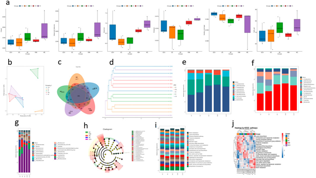 Figure 3. Gut microbiota modulation by Schisandra chinensis. (a) Alpha diversity of gut microbiota. (b) PCoA plot shows clustering differences between groups. (c) Venn diagram of ASV distribution. (d) Phylogenetic tree indicates microbiota convergence in SCH group toward normal controls. (e–g) Taxonomic composition at phylum, class, and genus levels. (h) LEfSe analysis identifying key microbial taxa across groups. (i,j) Functional predictions of gut microbiota using PICRUSt analysis. Data are expressed as the mean ± SD (n = 8).