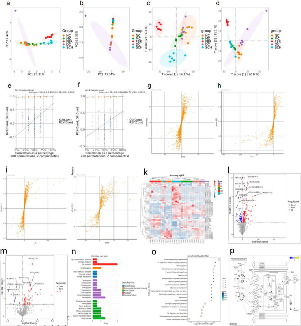 Figure 4. (a,b) Principal component analysis (PCA) plots under positive and negative ion modes reveal global metabolic shifts among the groups. (c,d) Partial least squares discriminant analysis (PLS-DA) shows clear separation between Schisandra chinensis (SCH)-treated mice and the model group (MC), indicating treatment-induced lipidomic alterations. (e,f) OPLS-DA permutation tests (200 iterations) validate the robustness and predictive power of the models, as evidenced by negative Q2 intercepts and non-overfitted R2 values. (g-j) S-plot analysis identifies key metabolites contributing to group separation in positive and negative ion modes. (k) Heatmap illustrating the relative abundance of key lipid metabolites identified by variable importance in projection (VIP) scores from PLS-DA analysis. (l,m) Volcano plots illustrate the distribution of significantly altered hepatic lipid species between the Schisandra chinensis (SCH) group and the model control (MC) group under positive (B) and negative (C) ion modes. Each dot represents a lipid metabolite. (n-p) Lipid pathway enrichment and metabolic network. Data are expressed as the mean ± SD (n = 8).