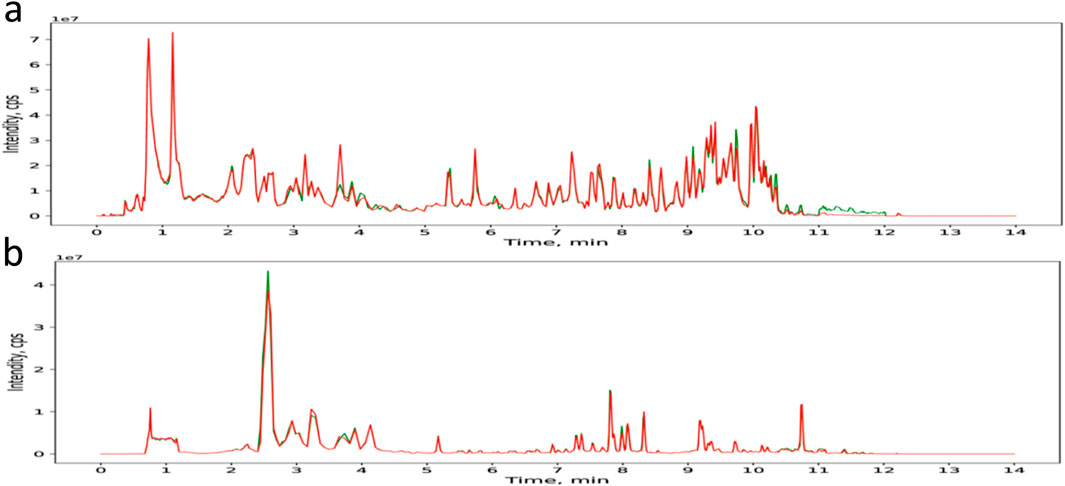 Figure 5. TIC of the components of SCH in positive and negative ion modes. (a) TIC of the components of SCH in positive ion mode. (b) TIC of the components of SCH in negative ion mode.