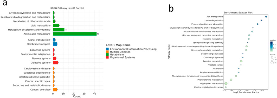 Figure 6. (a,b) KEGG enrichment of S. chinensis-derived metabolites.Metabolites were enriched in lipid-related pathways such as choline metabolism and fatty acid degradation. Data are expressed as the mean ± SD (n = 8).