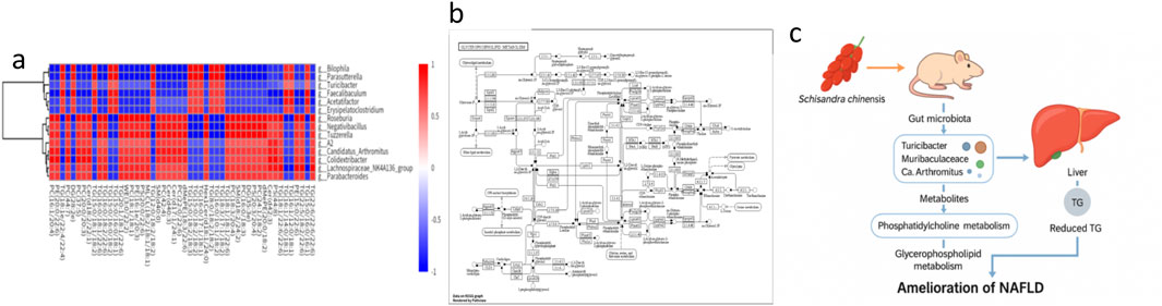 Figure 7. (a) Spearman correlation heatmap between hepatic triglyceride species and gut microbial genera. (b) Multi-omics interaction network. (c) Proposed mechanistic model of Schisandra chinensis in NAFLD improvement. Data are expressed as the mean ± SD (n = 8).