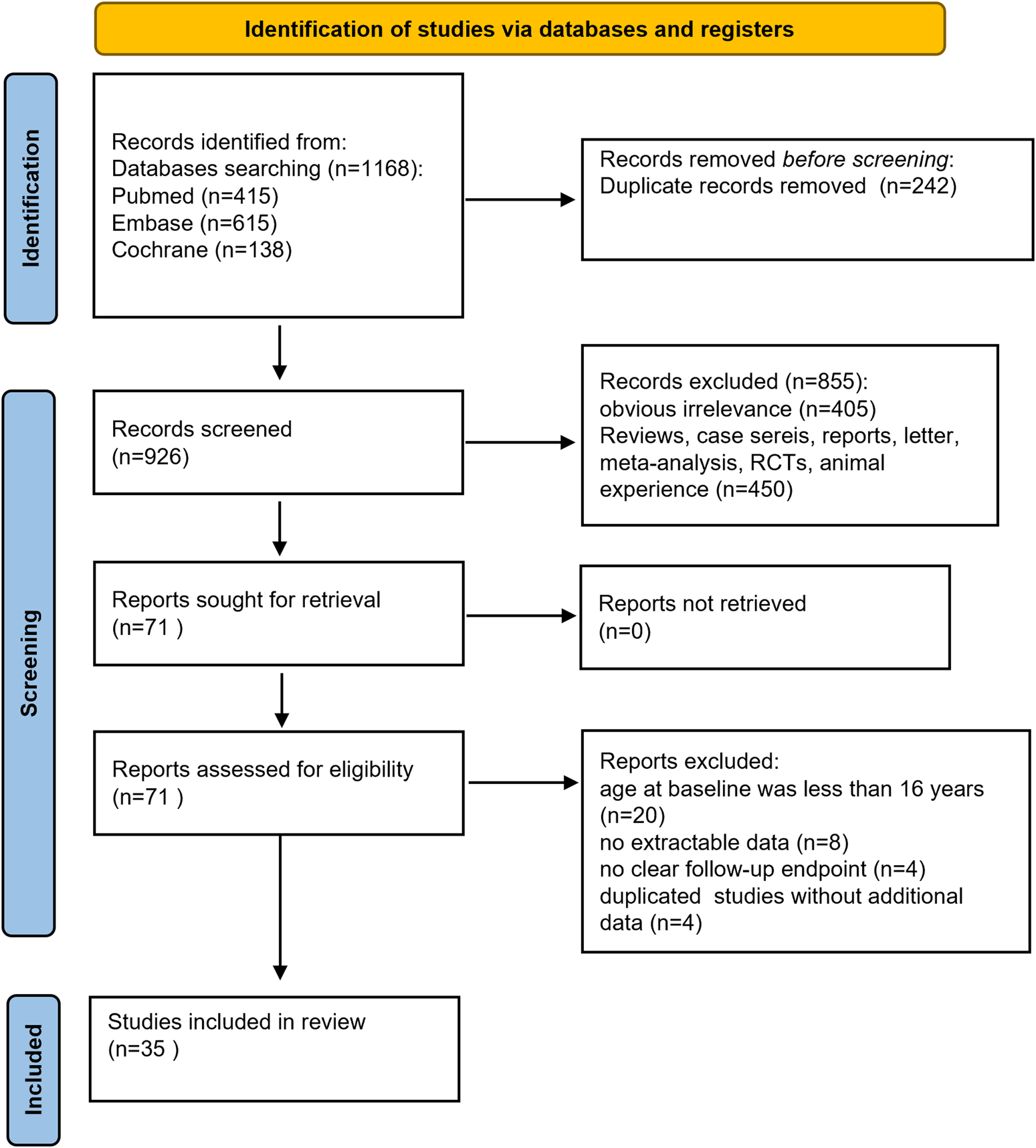 A total of 1,168 documents were obtained through electronic retrieval. Duplicate articles were deleted using EndNote 9.0 software, and 926 articles were retained after the removal of duplicates. Further screening of the titles and abstracts of the literatures excluded 405 articles that were irrelevant. Another 450 articles were excluded because they were reviews, commentaries, conference abstracts, animal- or cell-based studies, or RCTs and post hoc analyses of RCTs, leaving 71 studies for further review. After full-text assessment, 36 articles were excluded for several reasons, including 20 articles involving children, 8 articles with no extractable data, 4 studies with no clear follow-up endpoint, and 4 studies with duplicated results providing no additional data. Finally, 35 studies were included in this meta-analysis (Abraira et al., 2021; Adewusi et al., 2020; Andres et al., 2018; Arnold et al., 2020; Depondt et al., 2021; Faught et al., 2024; Fonseca et al., 2023; Fonseca et al., 2020; Gillis et al., 2021; Green et al., 2022; Halliday et al., 2023; Hirsch et al., 2018; Lafortune et al., 2020; Lattanzi et al., 2022; Lattanzi et al., 2023; Lattanzi et al., 2022; Lattanzi et al., 2021; Lattanzi, 2022a; Lattanzi et al., 2024; Lerche et al., 2020; Liguori et al., 2020; Roberti et al., 2024; Savastano et al., 2021; Siddiqui et al., 2023; Snoeren et al., 2022; Steinhoff et al., 2017; Steinhoff et al., 2020; Steinig et al., 2017; Stephen et al., 2021; Svendsen et al., 2022; Toledo et al., 2021; Villanueva et al., 2019; Villanueva et al., 2024; Yanes et al., 2023; Yates et al., 2015). The selection process of the included studies is presented in Figure 1. The characteristics of the patients are shown in Table 1. Overall, the included studies evaluated the effectiveness and safety of BRV in adults with various epilepsy syndromes. All studies were published between 2018 and 2024. A total of 10,095 patients were enrolled in this meta-analysis. A total of 33 studies compared the effect of BRV as add-on therapy with baseline, while three studies assessed BRV as add-on and monotherapy treatment for epilepsy. Except for two studies where the subjects were much older than in the other studies, patients across the studies were similar in terms of age, sex ratio, and concomitant ASMs. Since only one study examined the long-term efficacy of BRV (follow-up ≥12 months), we analyzed BRV treatment effects at 3, 6, and 12 months in comparison to baseline.