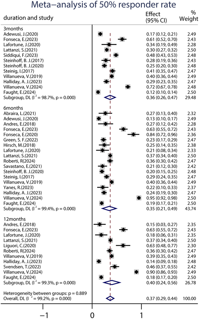 The efficacy outcomes of this meta-analysis were a 50% responder rate (defined as the proportion of patients whose seizure frequency was 50%–99% lower than that in the baseline period), seizure-free rate (defined as the proportion of patients who had no seizure relative to baseline), and retention rates (defined as the proportion of patients who continued BRV treatment until the follow-up period) after BRV treatment.