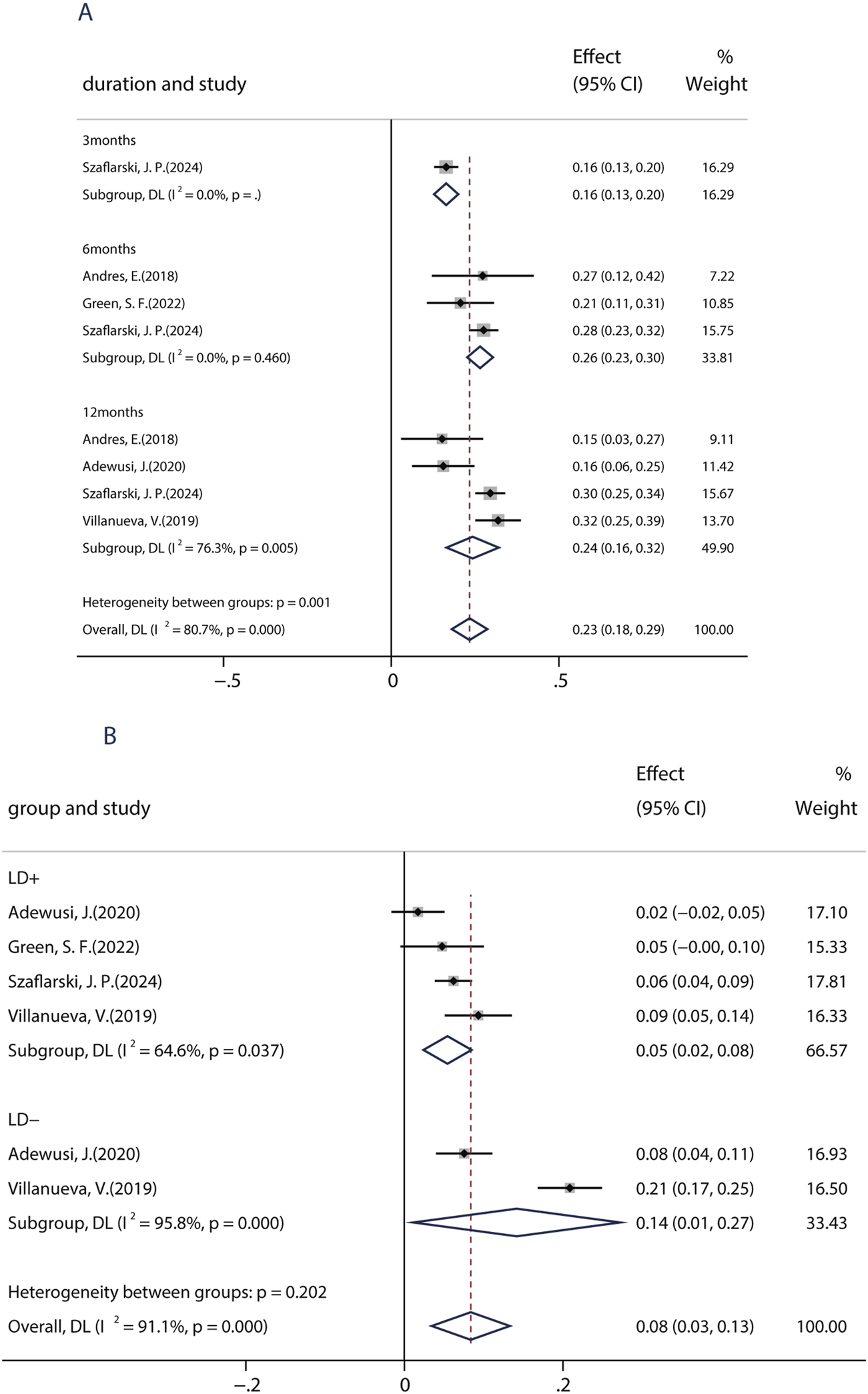 Patients with learning disabilities (LDs) are often excluded from RCT studies, so there is a lack of information on the efficacy and tolerability of BRV in such patients. Until now, a total of five studies (including 739 patients) assessed the effects of BRV in patients with epilepsy and LD. Among those studies, two studies compared the efficacy of BRV in patients with LD (LD+ group) and patients without LD (LD− group), whereas the remaining three studies evaluated its effects in patients with LDs. The pooled 50% responder rate in patients with IDs was 23.4% (95% CI: 0.18, 0.29) across all studies. Subgroup analysis showed that the pooled responder rates were 16.4% (95% CI: 0.13–0.20) and 26.5% (95% CI: 0.23–0.31) after 3 and 6 months of BRV treatment, respectively (Figure 4A). Notably, the pooled responder rate was 24.3% (95% CI: 0.17–0.32) from four studies for long-term (12-month follow-up) treatment. Further analysis indicated that the outcome in patients without LD was somewhat better than that in those with LD: the pooled ≥50% responder rate was 29% in the LD− group and 24% in the LD+ group. Then, the pooled RR with its corresponding 95% CI for the LD+ and LD− groups was calculated. No statistical difference was observed (RR = 0.83, 95% CI: 0.65–1.06), suggesting that patients with or without LD display similar 50% responder rates after BRV treatment. The pooled seizure-free rate was 14.2% (95% CI: 0.01–0.27) and 0.54% (95% CI: −0.02–0.85) for the patients in the LD− and LD+ groups, respectively (Figure 4B). The estimated RR was 0.47 (95% CI: 0.29–0.75) with low heterogeneity (I2 = 0.0%, p = 0.80), indicating that patients in the LD− group displayed a higher seizure-free rate than those in the LD+ group.