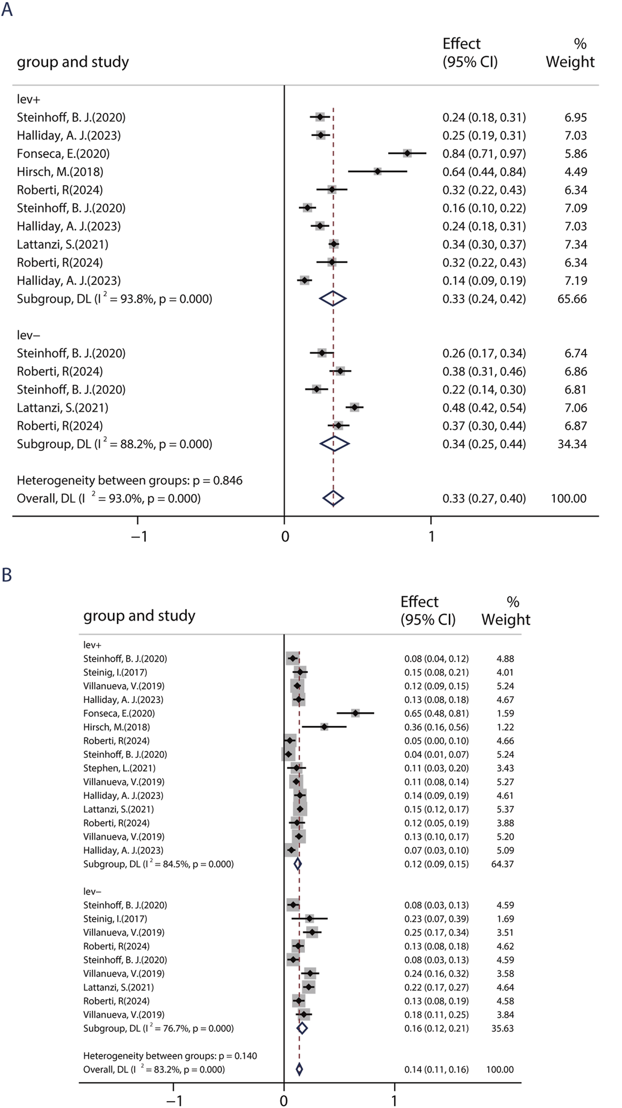 Figure 5. Impact of previous levetiracetam-exposure on BRV efficacy. (A) 50% responder rate of BRV in patients if they had previously used LEV. (B) Seizure-free rates of BRV in patients if they had previously used LEV.