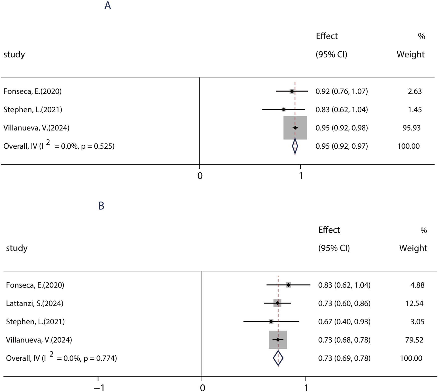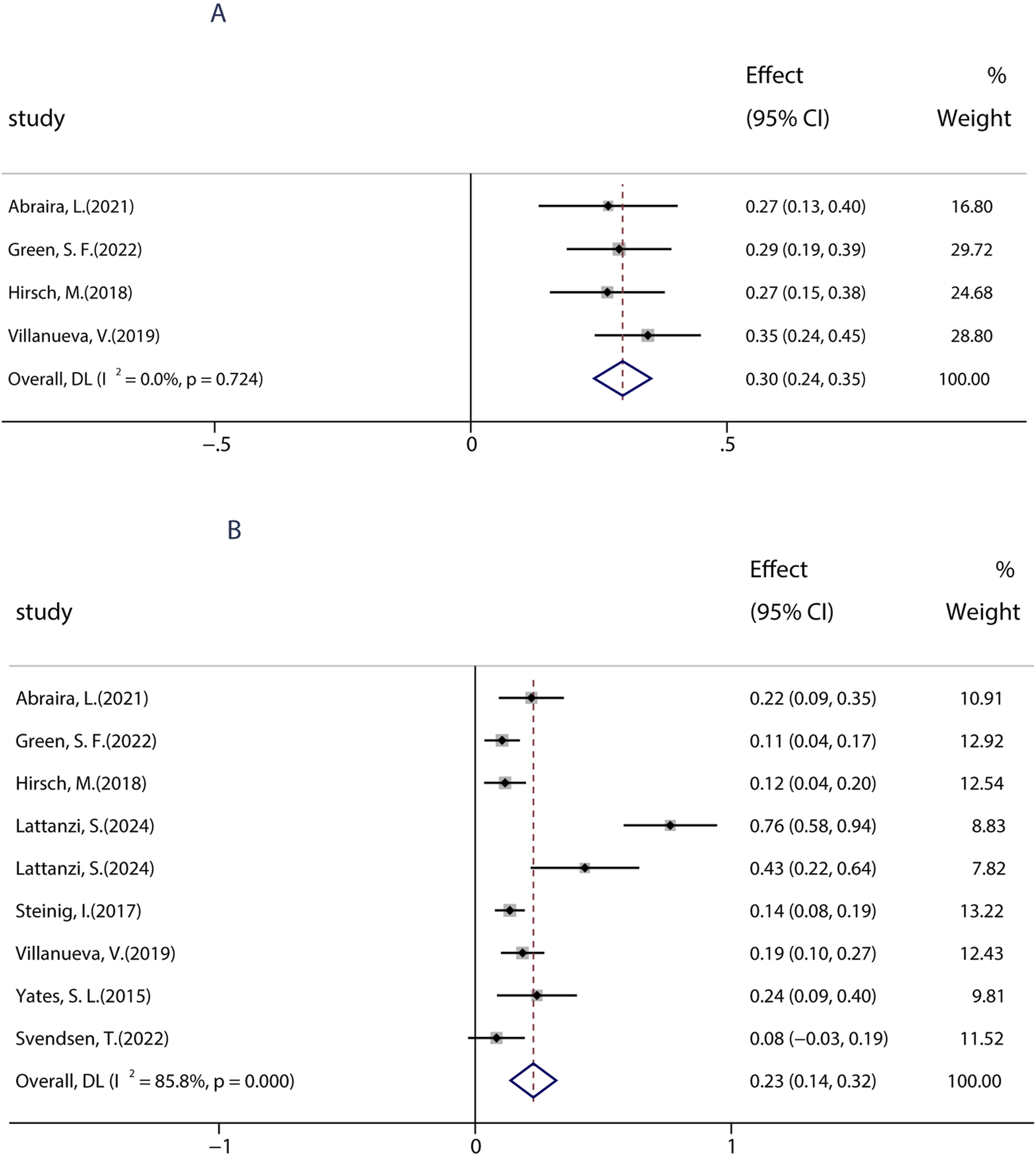Figure 7. Efficacy of BRV as monotherapy. (A) Pooled 50% responder rate of PER as monotherapy. (B) Pooled seizure-free rate of PER as monotherapy.
