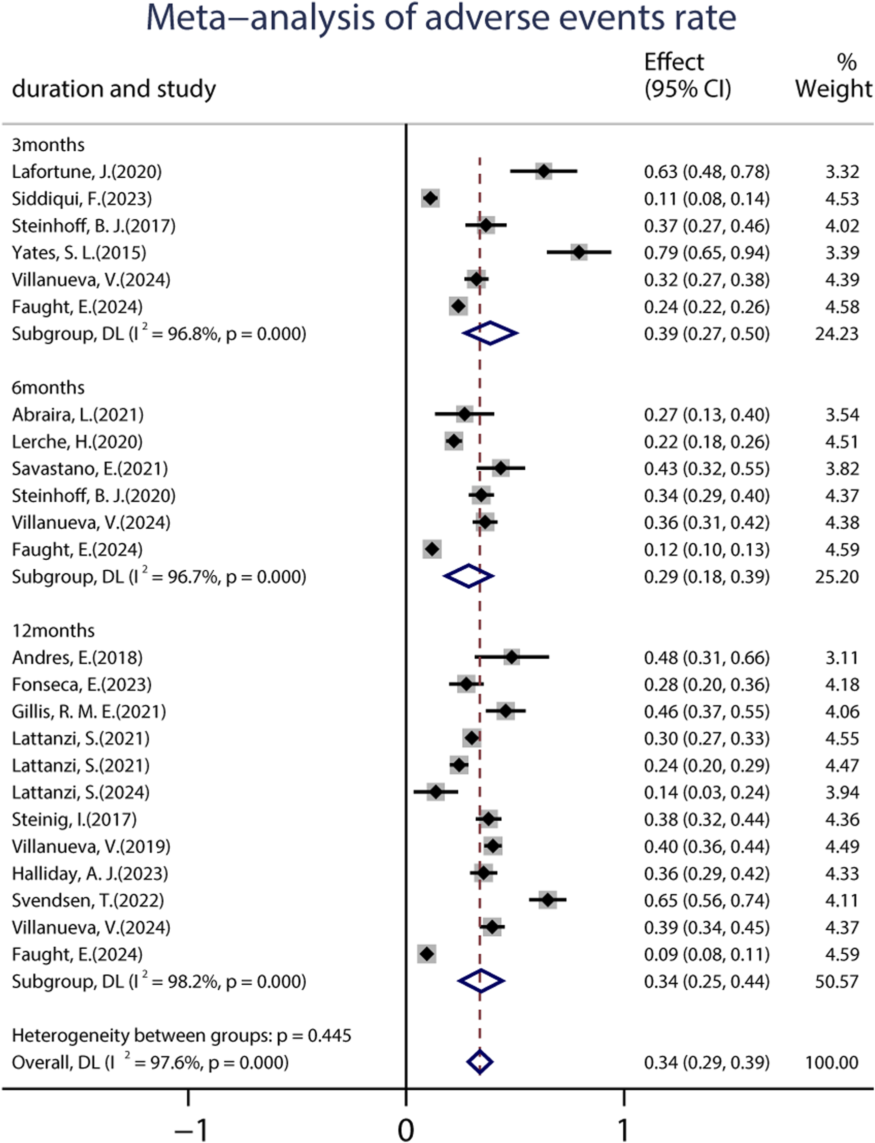 A total of 27 studies reported data on the proportion of patients who continued treatment at the end of the follow-up period, including 8,032 patients. The pooled retention rate from the random-effects model was 85.0% (95% CI: 0.80–0.90), 73.0% (95% CI: 0.68–0.78), and 65.0% (95% CI: 0.59–0.71) at 3, 6, and 12 months of PER treatment, respectively (Supplementary Figure S1).