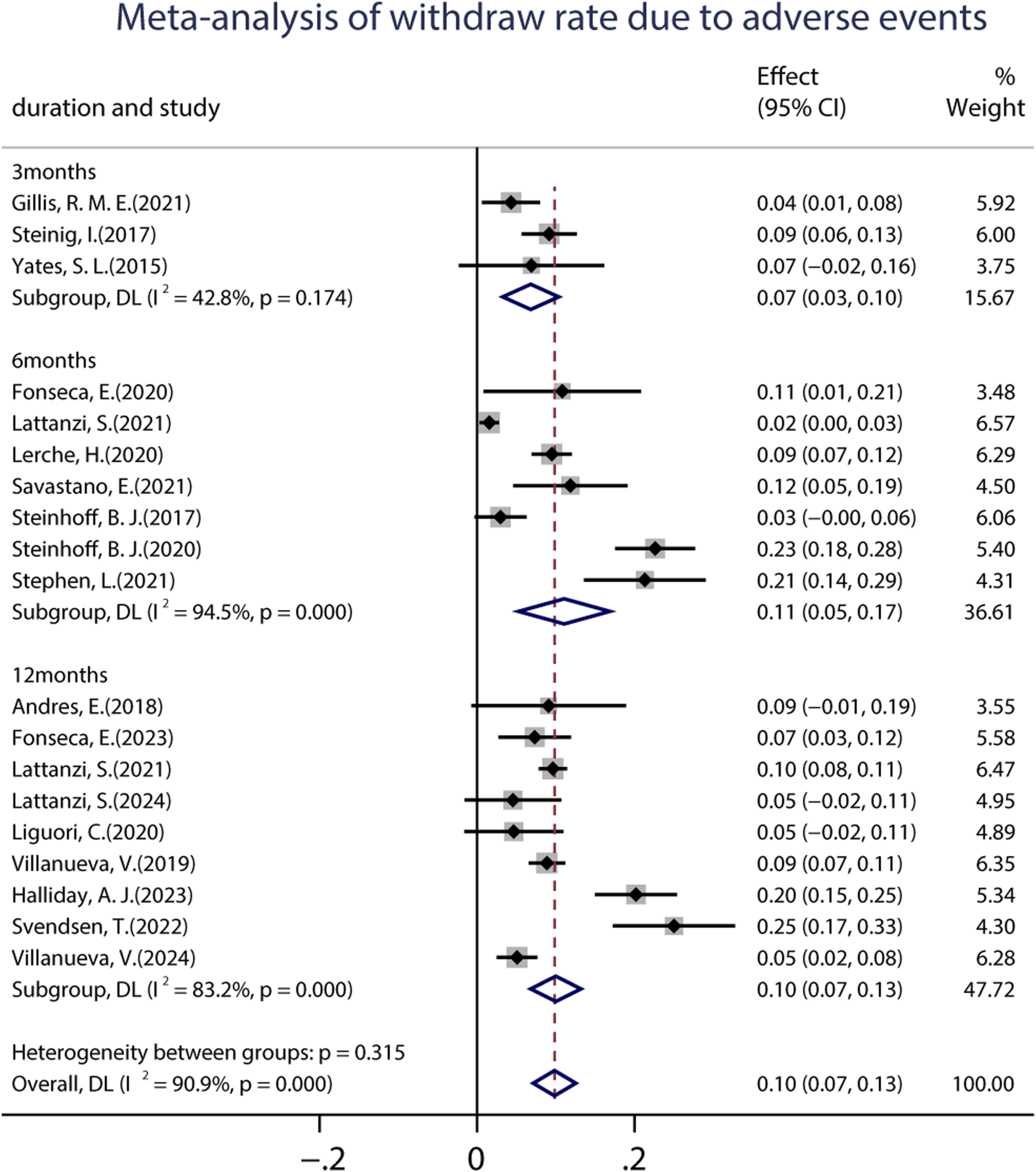 A total of 19 studies (including 6,160 patients) provided data on the proportions of participants who experienced at least one treatment-emergent adverse event (TEAE) after receiving at least one dose of BRV. The pooled incidence of AEs from the random-effects model indicated that it was 34.0% (95% CI: 0.29–0.39; p = 0.00) (Figure 8), regardless of the length of follow-up. Subgroup analysis showed that the pooled incidences of TEAEs at 3 and 6 months were 39.0% (95% CI: 0.27–0.50) and 29.0% (95% CI: 0.18–0.39), respectively (Figure 8). Further analyses of the incidence of pooled long-term (12-month follow-up) AEs were 34.0% (95% CI: 0.25–0.44). A total of 18 studies (including 3,967 patients) provided the withdrawal rate owing to AEs. The pooled withdrawal rates at 3, 6, and after 12 months of BRV treatment were 7.0% (95% CI: 0.03–0.10), 11.1% (95% CI: 0.05–0.17), and 10.0% (95% CI: 0.07–0.13), respectively (Figure 9).