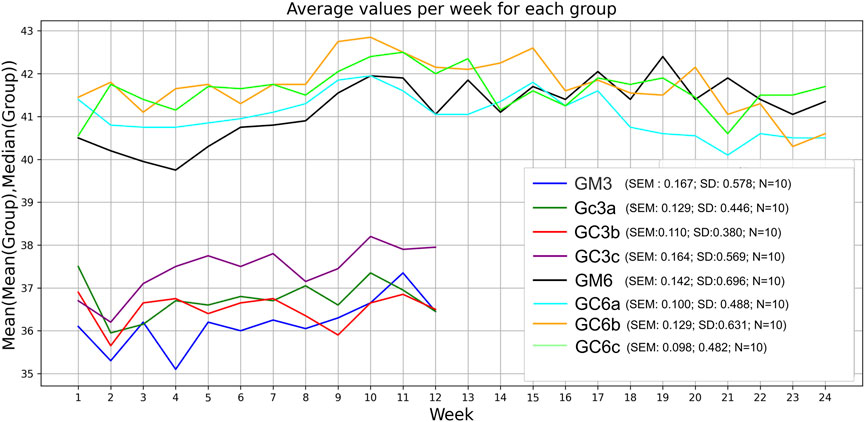 Mice received Cannabixir® Medium Flos therapy for 3 or 6 months at doses of 2.5, 5, or 10 mg/kg while maintained on a standard diet. No statistically significant differences in body weight were observed between treated and control animals at any dose or time point. Groups GM and GCc exhibited an ascending trend, with GM6 increasing by 1.5 g and GM3 by 0.8 g, and GC6c increasing by 1.8 g and GC3a by 1.2 g. In contrast, groups GCa and GCb showed a descending trend, with GC6a decreasing by 0.8 g and GC3a by 1.8 g, and GC6b decreasing by 0.7 g and GC3b by 0.3 g. Weight trajectories were not strictly monotonic, with fluctuations occurring during the first 1–1.5 months and occasional local peaks or troughs before reaching the final measurement. These patterns are illustrated in Figure 1, which presents combined mean–median values for all groups. In both the 3- and 6-month groups, the first peak or trough occurred early, within roughly the first 30% of the 3-month interval and before 50% of the 6-month interval.