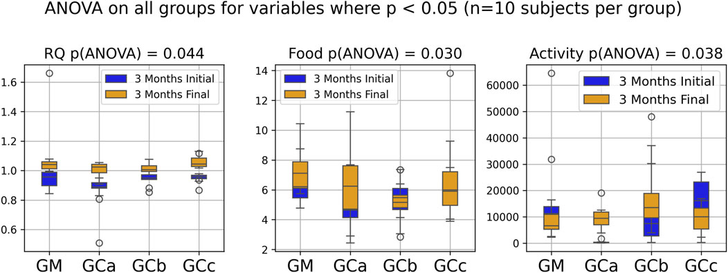 Figure 2. Indirect calorimetry assessment of energy metabolism in healthy, naturally aged mice following 3 months of chronic intermittent Cannabixir® Medium Flos therapy. Oxygen consumption (VO2), carbon dioxide production (VCO2), respiratory quotient (RQ) or respiratory exchange ratio were continuously recorded over a 24-h period using Oxylet Pro System- Physiocage (PanLab/Harvard Apparatus, Barcelona, Spain). Locomotor activity, food and water intake were recorded simultaneously. The presented plots compare initial and final experimental measurements for RQ, food intake and activity, highlighting only those with statistically significant differences according to ANOVA (p < 0.05). Significance codes: *p < 0.05; **p < 0.01; ***p < 0.001. The experimental groups were defined as follows: 3-month treatment groups: control (GM) and Cannabixir® Medium Flos at 2.5 mg/kg (GCa), 5 mg/kg (GCb) or 10 mg/kg (GCc).