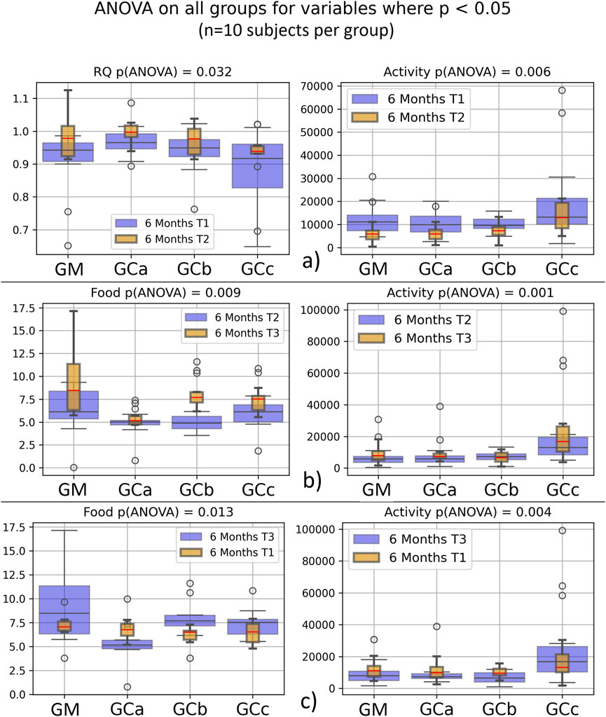 Figure 3. Energy metabolism in healthy, naturally aged mice after 6 months of chronic intermittent Cannabixir® Medium Flos treatment assessed by indirect calorimetry. Oxygen consumption (VO2), carbon dioxide production (VCO2), respiratory quotient (RQ) or respiratory exchange ratio were continuously recorded over a 24-h period using Oxylet Pro System- Physiocage (PanLab/Harvard Apparatus, Barcelona, Spain). Locomotor activity, food and water intake were recorded simultaneously. Sub-plots show paired variables from T1–T3 datasets, with significant differences (p < 0.05) for Activity (a–c), Food (b,c) and RQ (c). Data were collected at three time points -baseline (T1), midpoint (T2), and endpoint (T3) to monitor temporal changes during treatment. Significance codes: *p < 0.05; **p < 0.01; ***p < 0.001. The experimental groups were defined as follows: six-month treatment groups: control (GM) and Cannabixir® Medium Flos at 2.5 mg/kg (GCa), 5 mg/kg (GCb) or 10 mg/kg (GCc); T1–T3 datasets.