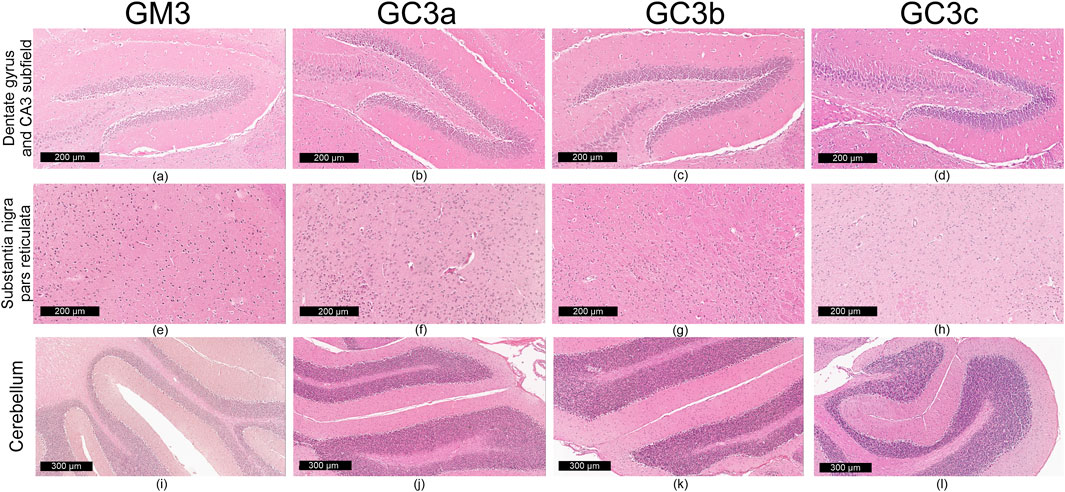 Figure 4. Representative images (n = 10 per group) showing normal histoarchitecture in dentate gyrus and CA3 subfield (a–d) neuronal and glial cells in substantia nigra–pars reticulata (e–h) and microscopic integrity of cerebellar organization (i–l) in the mice brain–in 3-month treatment groups (G1): control (GM3) and Cannabixir® at 2.5 mg/kg (GC3a), 5 mg/kg (GC3b) or 10 mg/kg (GC3c).