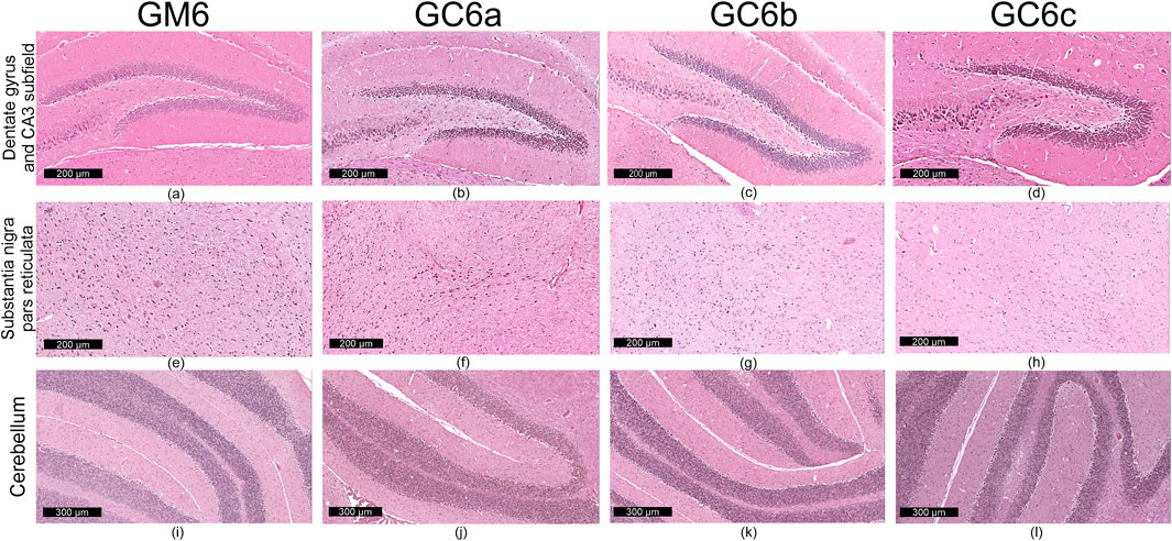 Comprehensive histological examination demonstrated that the cytoarchitecture of major brain regions - dentate gyrus, CA3 subfield of the hippocampus, substantia nigra pars reticulata and cerebellum - was largely preserved across all experimental subgroups. The dentate gyrus and CA3 subfield maintained their characteristic three- and five-layer organizations, respectively, indicating that hippocampal networks remained structurally intact (Mortessagne et al., 2024). Likewise, the substantia nigra pars reticulata showed a normal arrangement of neurons and glial elements, and the cerebellum displayed the classical three-layer pattern. Only limited focal changes were observed, including perineuronal edema adjacent to Purkinje cells in the GC6b and GC6c subgroups and mild astrocytic hyperplasia in the substantia nigra pars reticulata, while oligodendrocytes remained unaffected. No morphological markers of neurodegeneration - such as hypertrophy, necrosis, pyknosis, vacuolization, chromatolysis or white matter spongiosis - were detected. Small, randomly distributed lymphocytic clusters were present but without signs of diffuse inflammatory damage. Such discrete alterations may reflect age-related processes, including low-grade neuroinflammation, oxidative stress, impaired neurogenesis or mild neuronal loss (Giannos and Prokopidis, 2022; Lana et al., 2025). Although these age-associated processes are interrelated and can mutually potentiate one another, in our cohort of healthy, naturally aged mice (13–16 months) they did not compromise the global cytoarchitecture or structural integrity of the evaluated neural structures.