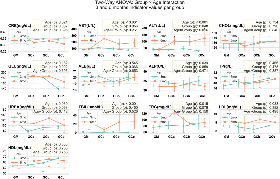 Figure 6. Serum biochemical parameters were assessed in mice following chronic oral administration of Cannabixir® Medium Flos. Data are expressed as mean ± SEM. Statistical analysis was performed using two-way ANOVA to evaluate the effects of Age and Group factors, as well as their interaction (Age × Group). Age refers to treatment exposure duration (3 or 6 months), while Group indicates comparisons within the same exposure duration (intra-group analysis at 3 or 6 months). The Age × Group interaction represents comparisons between treatment groups across different exposure durations (inter-group comparison between 3- and 6-month cohorts). Significant differences are indicated as follows: *p < 0.05; **p < 0.01; ***p < 0.001. CRE, creatinine (mg/dL); ALT, alanine aminotransferase (U/L); AST, aspartate aminotransferase (U/L); CHOL, total cholesterol (mg/dL); GLU, glucose (mg/dL); ALB, albumin (g/L); ALP, alkaline phosphatase (U/L); TP, total protein (g/L); UREA, urea (mg/dL); TBIL, total bile acids (μmol/L); TRG, triglyceride (mg/dL); LDL cholesterol, low-density lipoprotein (mg/dL); HDL cholesterol, high-density lipoprotein (mg/dL); GM, control groups; GCa, Cannabixir® Medium Flos, 2.5 mg/kg groups; GCb, Cannabixir® Medium Flos, 5 mg/kg; GCc, Cannabixir® Medium Flos, 10 mg/kg; therapy period is indicated by line color: 3 months (green) and 6 months (orange).