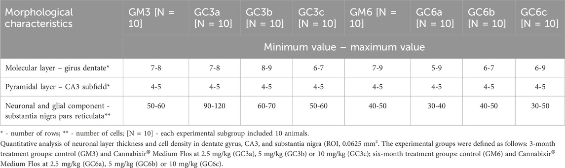 The morphological analysis was focused on the following areas of interest: the dentate gyrus and CA3 subfield at the hippocampus; the substantia nigra pars reticulata–part of the basal ganglia; the cerebellar molecular layer. These regions were selected based on the presence of cannabinoid receptors, as reported in the literature (Herkenbaum et al., 1991).