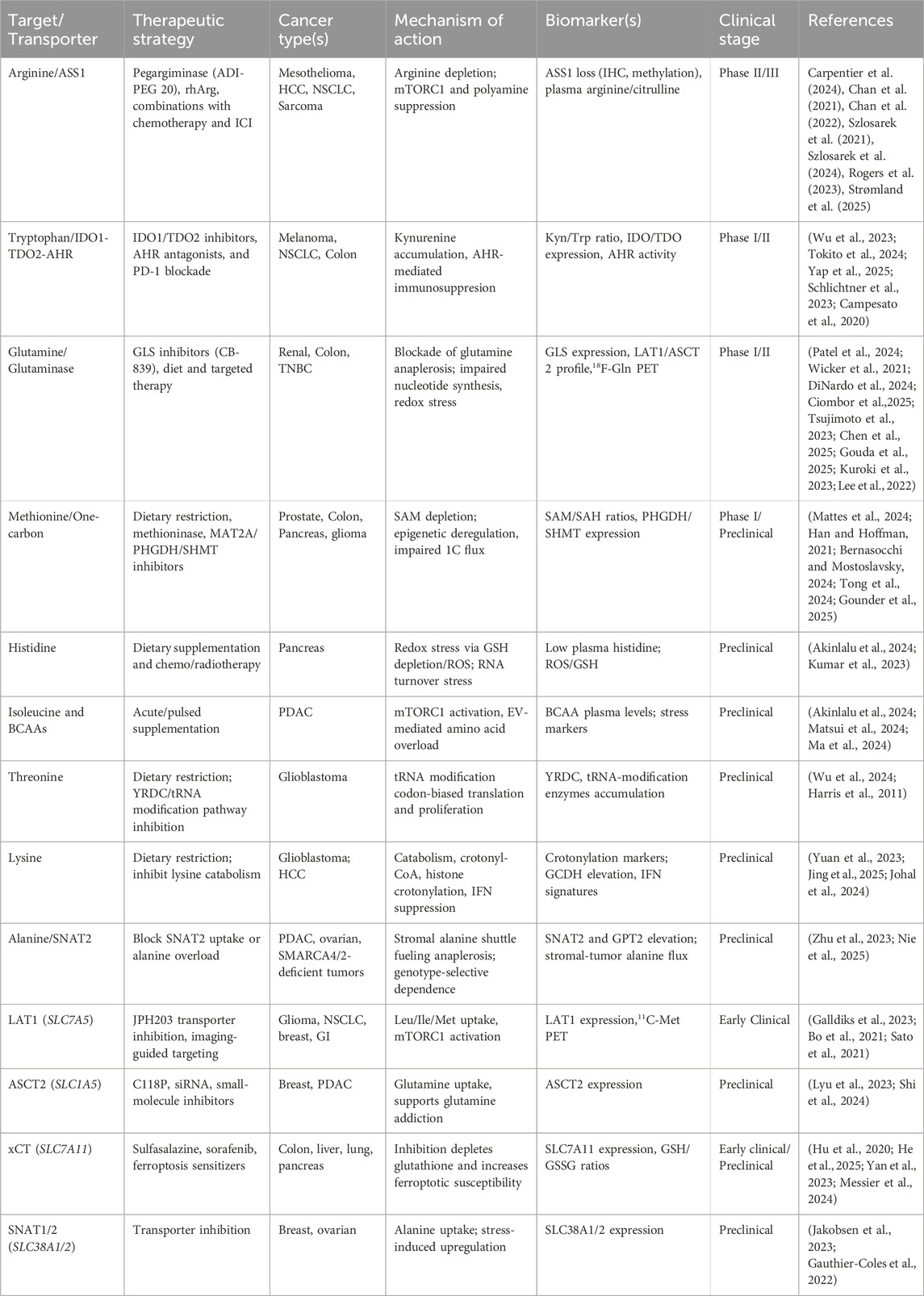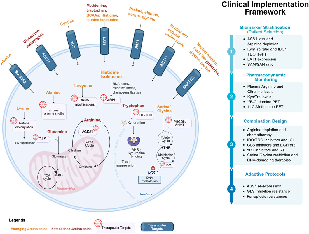 Disruptions in amino acid pathways are a hallmark of cancer. Cancer cells reprogram amino acid uptake and utilization to sustain biomass accumulation, maintain antioxidant defenses, and promote growth signaling (Saxton and Sabatini, 2017). These adaptations create differences in tumor and normal tissues that can be therapeutically exploited. Clinical studies have already established proof-of-concept. For example, arginine depletion has shown activity in tumors deficient in argininosuccinate synthase 1 (ASS1) (Chan et al., 2021; Chan et al., 2022; Szlosarek et al., 2021), the enzyme that enables cells to synthesize arginine de novo. Glutaminase inhibitors, which block the enzyme responsible for converting glutamine into glutamate and feeding the tricarboxylic acid (TCA) cycle, have been evaluated in glutamine-dependent cancers, both as single drug therapy and in rational drug combinations (Patel et al., 2024; Wicker et al., 2021; DiNardo et al., 2024). Similarly, inhibition of tryptophan catabolism through indoleamine 2,3-dioxygenase (IDO) and tryptophan 2,3-dioxygenase (TDO), enzymes that degrade tryptophan to kynurenine, has been explored to restore antitumor immunity (Wu et al., 2023; Zakharia et al., 2021). These studies establish the feasibility of targeting amino acid metabolism in patients and demonstrate two recurring challenges: tumors can rewire their metabolism in ways that allow them to escape treatment, and the lack of reliable biomarkers makes it difficult to identify which patients are most likely to benefit from treatment (Akinlalu et al., 2025; Balamurugan et al., 2025; Rasuleva et al., 2023; Rasuleva et al., 2021). Recent advances have begun to address these limitations, with ASS1 loss used as a biomarker for arginine deprivation (Carpentier et al., 2024), kynurenine-to-tryptophan ratios to monitor IDO/TDO inhibition (Wu et al., 2023; Huang et al., 2022), and circulating metabolites or amino acid-based positron emission tomography (PET) tracers to confirm drug activity (Galldiks et al., 2023). These developments represent important steps toward more precise, biomarker-guided use of amino acid therapies.