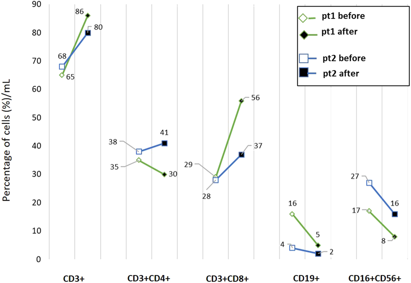 Flow cytometric profiling of peripheral blood lymphocyte subsets in two patients enrolled in the study. Whole blood samples were analyzed by multiparameter flow cytometry to quantify the frequencies of CD3+ T cells, CD3+CD4+ helper T cells, CD3+CD8+ cytotoxic T cells, CD19+ B lymphocytes and natural killer (CD3−CD16+CD56+) cells. Samples were collected at the beginning of the treatment (before) and after the appearance of irAE (after). pt: patient.