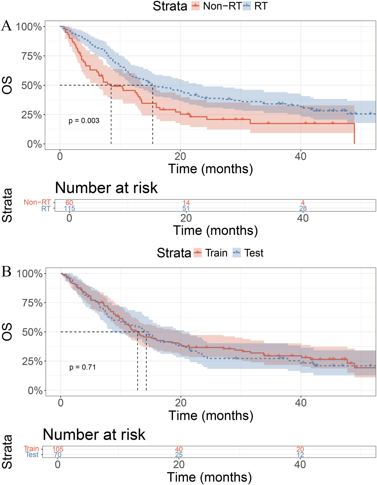 Figure 1. Kaplan–Meier curves for overall survival (OS). (A) Patients receiving RT showed better OS than those without RT (p = 0.003). (B) No significant OS difference between training and test sets (p = 0.71).