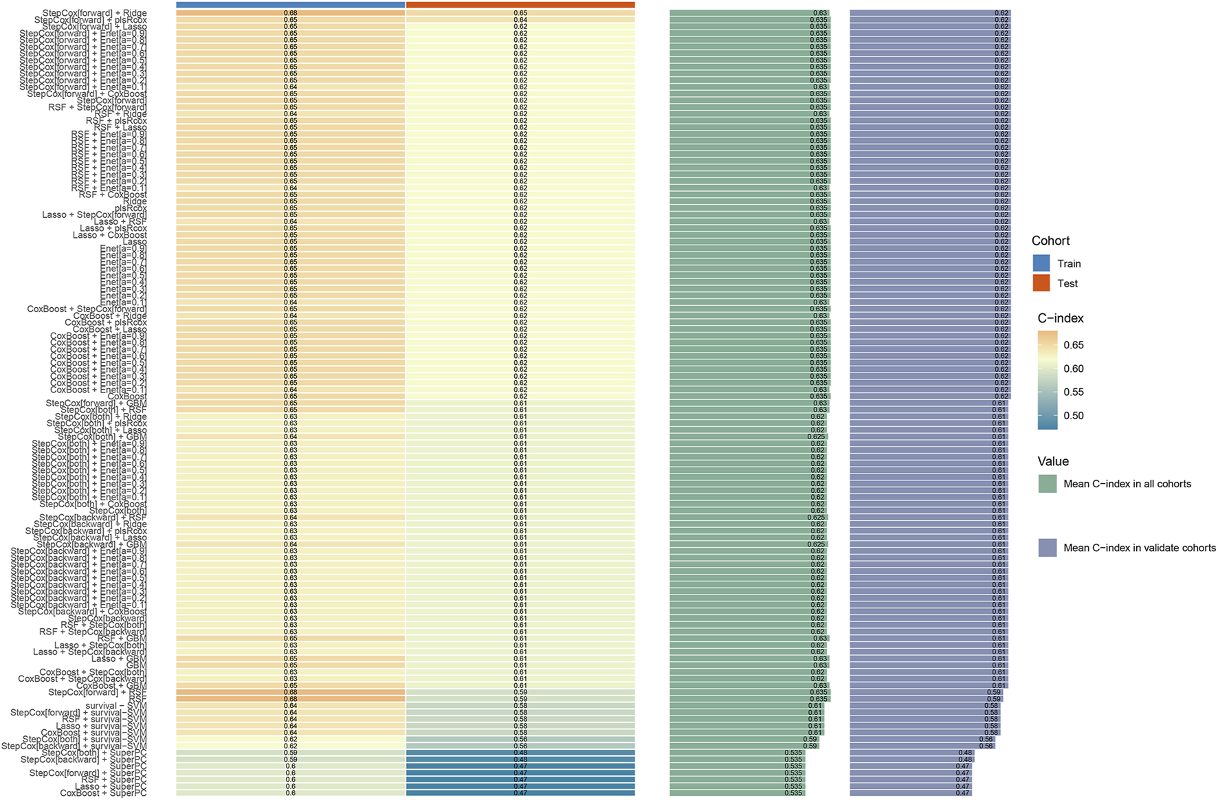Figure 2. The concordance index (C-index) of 101 machine learning models in the training and validation cohorts.