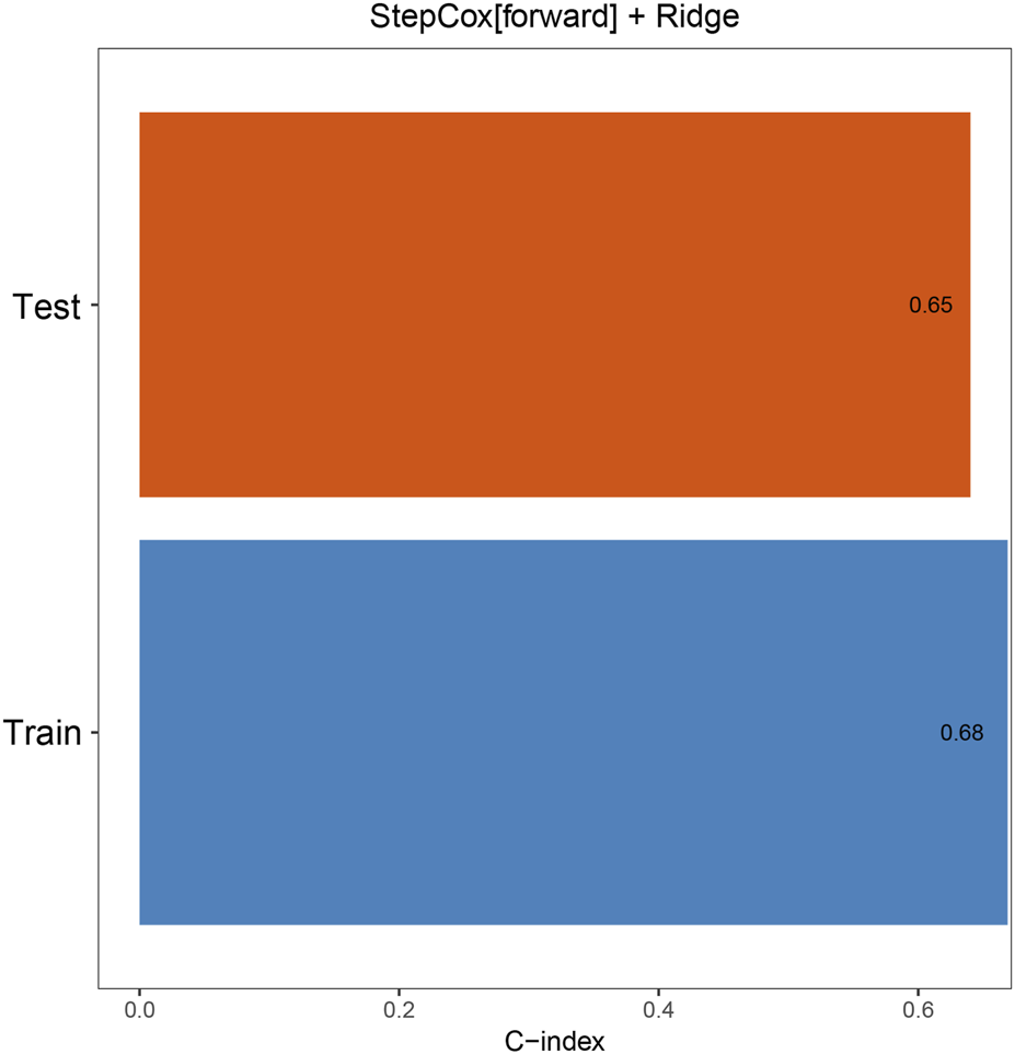 Figure 3. The concordance index (C-index) of StepCox (forward) + Ridge model in the training and validation cohorts.