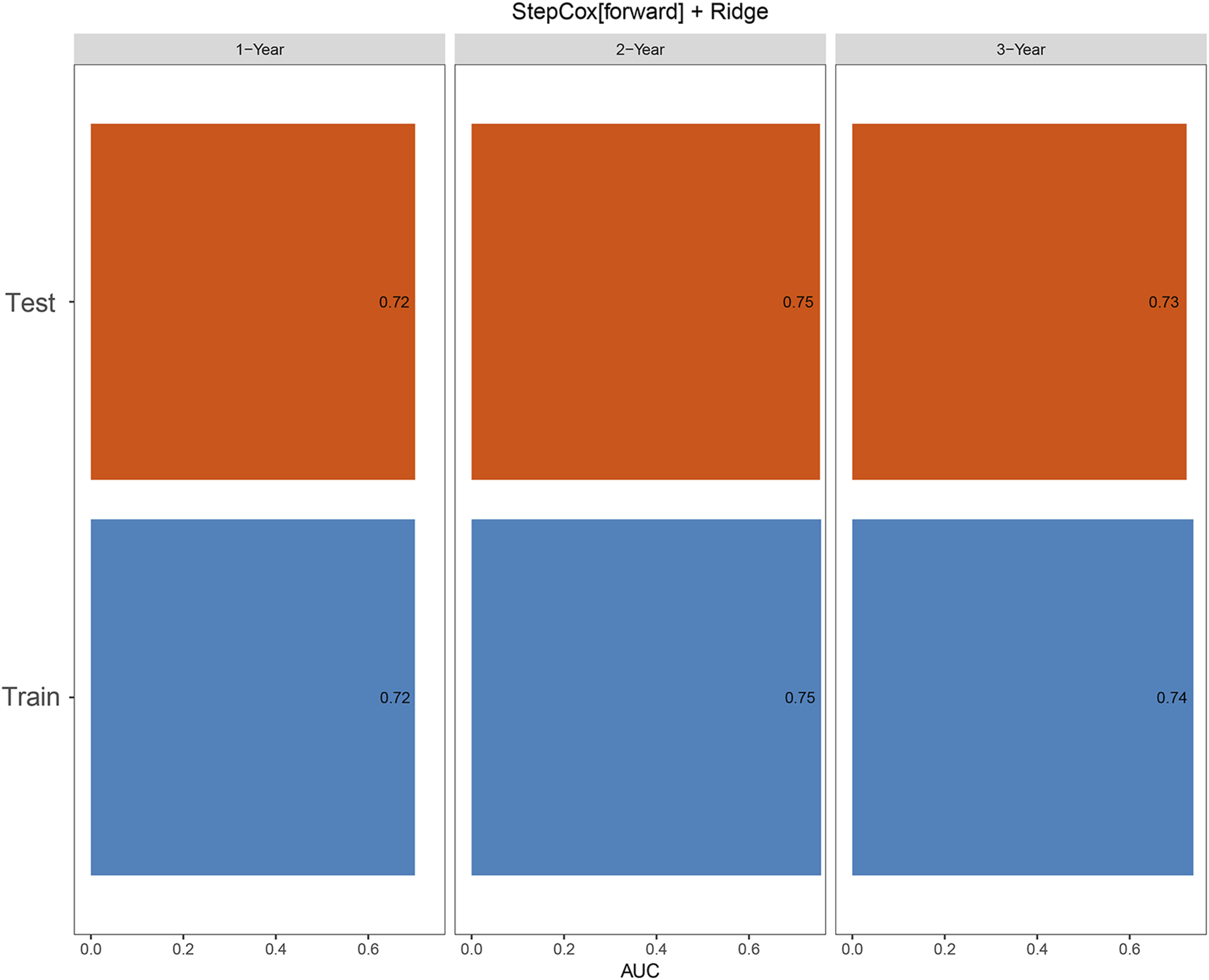 The StepCox (forward) + Ridge model demonstrated superior performance compared with conventional Cox regression and other ML algorithms tested in this study (Li et al., 2025; Su et al., 2025). The StepCox (forward) procedure enhances variable selection efficiency by iteratively including variables with the strongest prognostic contribution, which improves interpretability and reduces model complexity (Chen et al., 2025). In contrast, the Ridge component applies L2 regularization to mitigate multicollinearity and prevent overfitting, thereby increasing model stability and robustness across datasets (Yıldırım and Özkale, 2023). By combining these two complementary strengths, the StepCox (forward) + Ridge framework achieves a balance between interpretability and predictive accuracy, making it particularly suitable for clinical prognostic modeling in heterogeneous populations such as advanced HCC.