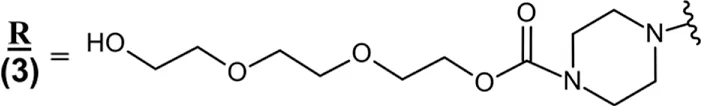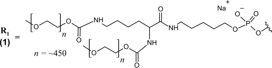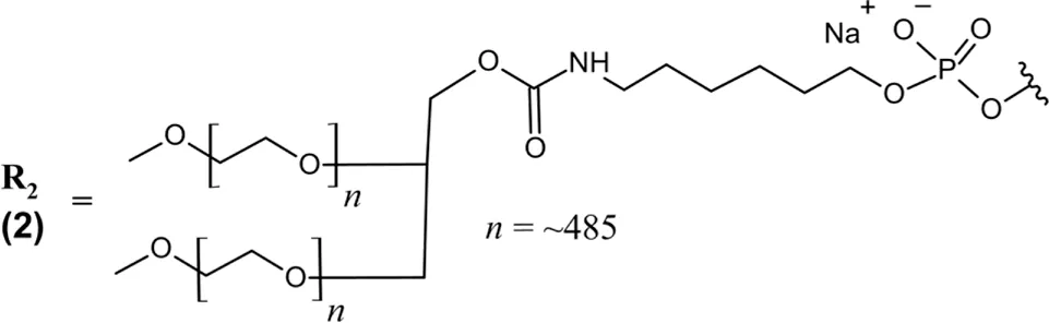 PEGylated 39-nt RNA aptamer; all PO (∼) linkages; NaCl/NaPO4 solution for IVT injection; MW = 56 kDa (free acid bound to one 43 kDa PEG moiety) R2 ― 5′-Cf ∼ Gm ∼ Cf ∼ Cf ∼ G ∼ Cf ∼ Gm ∼ Gm ∼ Uf ∼ Cf ∼ Uf ∼ Cf ∼ Am ∼ Gm ∼ Gm ∼ Cf ∼ G ∼ Cf ∼ Uf ∼ Gm ∼ Am ∼ Gm ∼ Uf ∼ Cf ∼ Uf ∼ Gm ∼ Am ∼ Gm ∼ Uf ∼ Uf ∼ Uf ∼ A ∼ Cf ∼ Cf ∼ Uf ∼ Gm ∼ Cf ∼ Gm∼(3′–3′)dT-5′ ![]() |