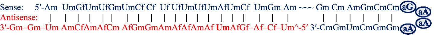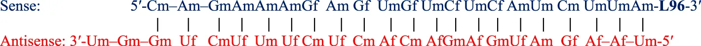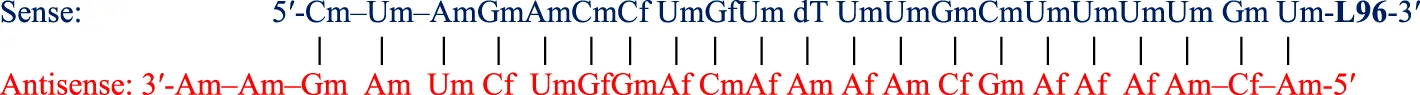 Abbreviations: A, adenosine; AdemA, GalNAc aminosugar conjugated adenosine; AdemG, GalNAc aminosugar conjugated guanosine; Af, 2′-fluoroadenosine; AHP, acute hepatic porphyria; ALAS1, delta-aminolevulinate synthase 1; ASCVD, atherosclerotic cardiovascular disease; AT, antithrombin; CM, cardiomyopathy; Cm, 2′-O-methylcytidine; Gf, 2′-fluoroguanosine; Gm, 2′-O-methylguanosine; HAO1, hydroxyacid oxidase 1; hATTR, hereditary transthyretin-mediated amyloidosis; HeFH, heterozygous familial hypercholesterolemia; IV, intravenous; L96, tri-N-acetylgalactosamine (GalNAc); LDHA, lactate dehydrogenase A; LNP, lipid nanoparticle; PBS, phosphate buffered saline; PCSK9, proprotein convertase subtilisin/kexin type 9; PH1, primary hyperoxaluria type 1; PS (−), phosphorothioate linkage; RoA, route of administration; SQ, subcutaneous; TTR, transthyretin; Um, 2′-O-methyluridine; Um^, 2′-O-methyl-4′-O-((methoxy)phosphoryl)methyluridine; WFI, water for injection. Sense (blue) and antisense (red) strand sequences were obtained from FDA approved product inserts. Vertical lines illustrate Watson-Crick base pairing. Molecular weights in kDa were rounded to the nearest thousandth.