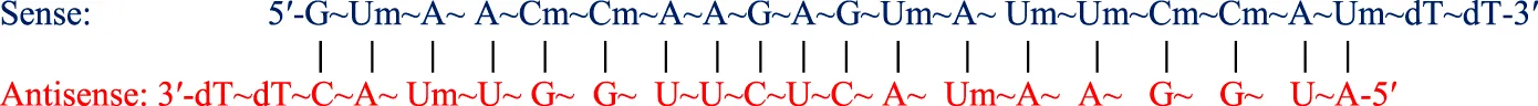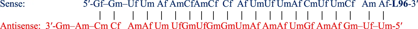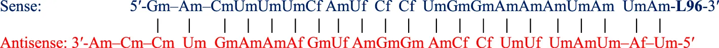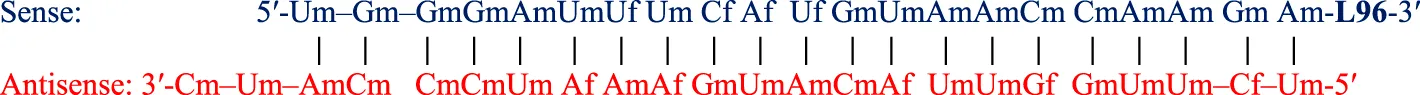 Another key structural element present in givosiran is the two-nucleotide overhang present at the antisense 3′terminus. In addition to providing further nuclease resistance, asymmetric design of siRNA duplexes influence the incorporation of the antisense/guide strand to the RISC (Sano et al., 2008). The conjugation of L96 ligand to the sense 3′terminus and presence of a two-nucleotide overhang at the 3′antisense terminus represent key advancements in the design of RNAi therapeutics that would be utilized extensively in later therapies (Figure 2). Several other siRNA drugs that mirror these structural innovations are detailed herein.