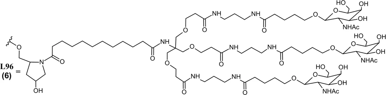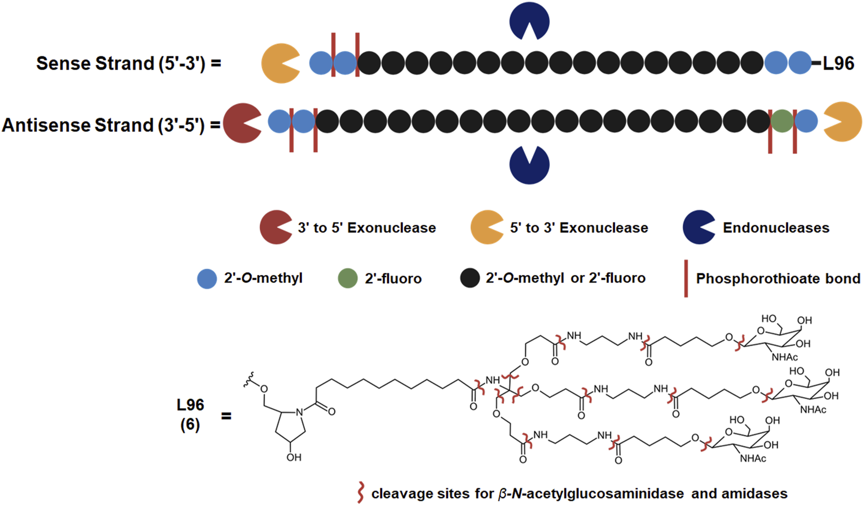 Common metabolic pathways of GalNAc-conjugated siRNA drugs. Some endogenous nucleases may cleave the sense and antisense strands at unique locations while exonucleases metabolize an RNA strand from the 5′or 3′end. Illustrated chemical modifications of ribonucleosides and the linkages are critical in reducing nuclease mediated degradation, and they are commonly found amongst the FDA-approved siRNA drugs. GalNAc conjugation of the sense 3′terminus is widely employed to improve nuclease resistance and hepatocyte uptake, found among five out of seven FDA-approved siRNA drugs. L96 and similar GalNAc moieties, however, are subject to metabolism by ß-N-acetylglucosaminidase and amidases. These enzymes can cleave several points within the L96 structure, giving rise to a variety of metabolites possessing different lengths and remaining number of GalNAc moiety.