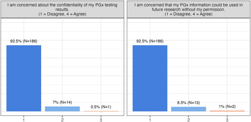 Two bar graphs compare survey responses about concerns related to PGx testing. Both graphs show that 92.5% (186 respondents) agree with the statements. The left graph indicates concerns about confidentiality, while the right shows worries about PGx information used without permission. In both graphs, very few respondents disagree or are neutral.
