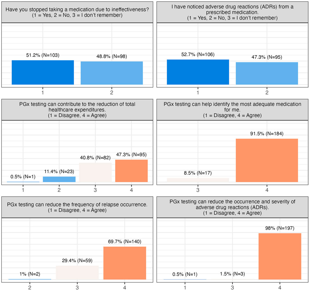 Six bar graphs displaying survey responses on medication effectiveness and pharmacogenomic (PGx) testing. 1. First graph: 51.2% stopped medication due to ineffectiveness; 48.8% did not.2. Second graph: 52.7% noticed adverse drug reactions; 47.3% did not.3. Third graph: 47.3% agree PGx reduces healthcare costs; 11.9% disagree.4. Fourth graph: 91.5% agree PGx identifies adequate medication; 8.5% disagree.5. Fifth graph: 69.7% agree PGx reduces relapse frequency; 30.4% disagree.6. Sixth graph: 98% agree PGx reduces adverse drug reactions; 2% disagree.