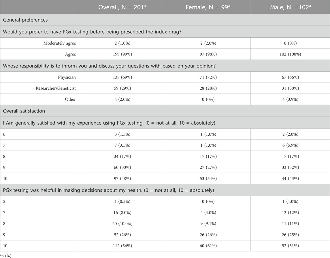 Table 2. Attitudes, opinions and perceptions towards PGx testing. Questions related to general preferences were asked before the pharmacogenetic testing, while overall satisfaction related questions were asked after the pharmacogenetic testing was applied.