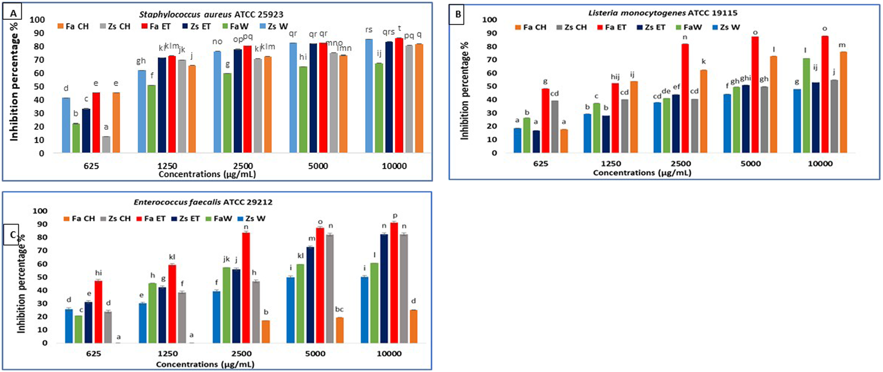 The ethanolic extracts of Z. spinosa and F. aegyptia also displayed notable antibacterial activity against S. aureus ATCC 25923 and L. monocytogenes ATCC 19115, with MIC values of 625 μg/mL and 1,250 μg/mL, respectively.
