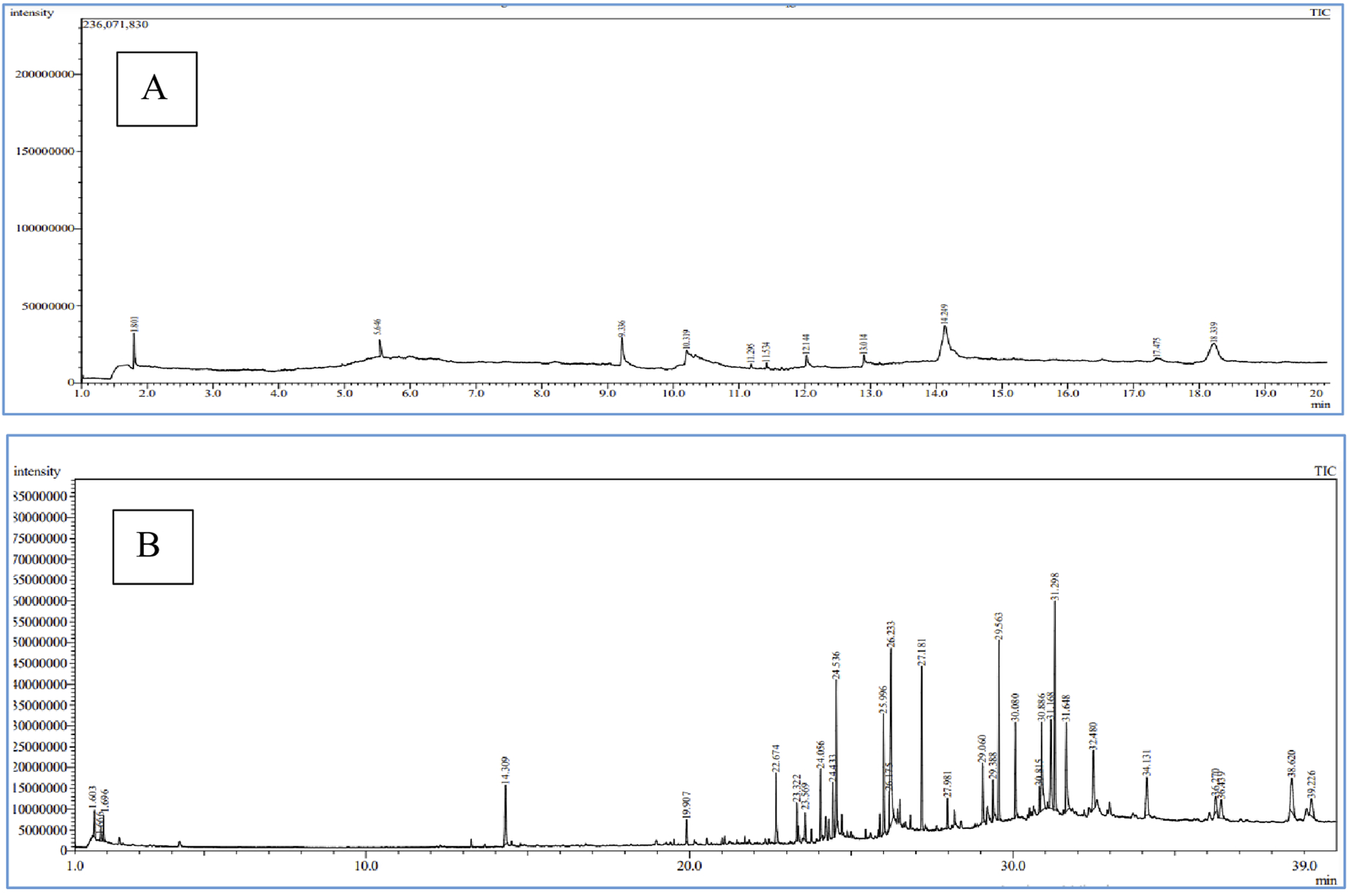 The phytocompounds present in the most active samples were determined by the GC-MS as previously described (Besbes et al., 2025). Briefly, this analysis used a Perkin Elmer Clarus 600 T coupled to a single quadrupole mass spectrometer. An elite 5-M column with helium gas as a carrier, flowing at 1 mL per minute, was employed. The temperature started at 40 °C for 1 minute, then increased to 150 °C at 10 °C per minute, and finally to over 300 °C at the same rate for 3 minutes. The inlet line and ion source temperatures were set to 220 °C and 200 °C, respectively. Ionization occurred at 70 eV, with a mass scanning range of 40–618 m/z. Peaks were identified by comparing them to Wiley sixth. edition mass spectral library, standards, and published data. Percentages of detected compounds were calculated using GC peak areas. Kovats index of each compound was determined using retention times of C6-C26 n-alkanes and compared to literature values (Adams, 2017).